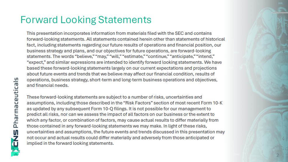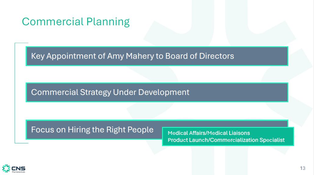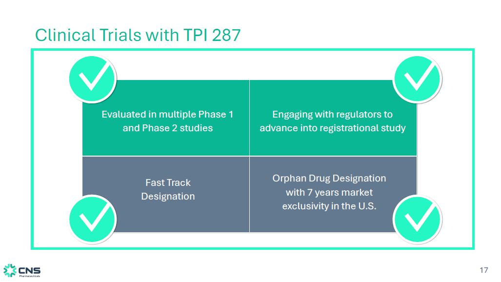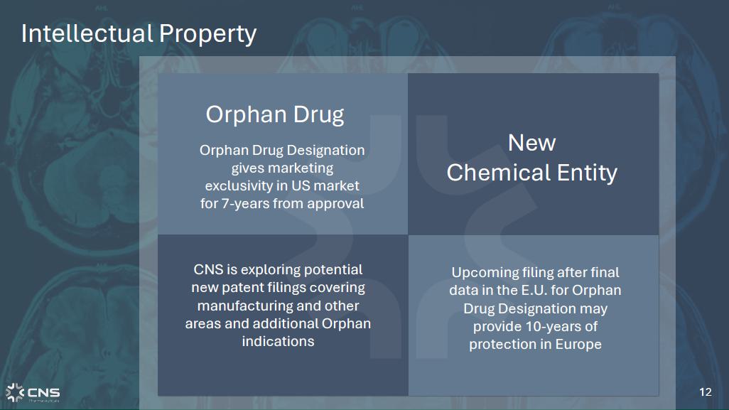 Intellectual Property Orphan Drug Orphan Drug Designation gives marketing exclusivity in US market for 7 - years from approval 12 Upcoming filing after final data in the E.U. for Orphan Drug Designation may provide 10 - years of protection in Europe CNS is exploring potential new patent filings covering manufacturing and other areas and additional Orphan indications New Chemical Entity