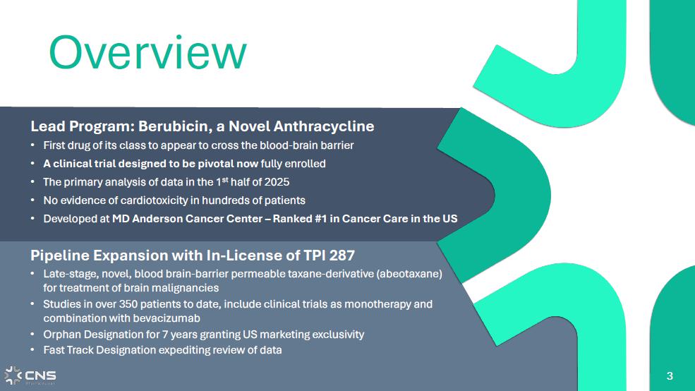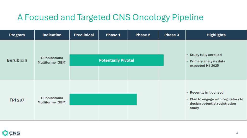 Overview Lead Program: Berubicin, a Novel Anthracycline • First drug of its class to appear to cross the blood - brain barrier • A clinical trial designed to be pivotal now fully enrolled • The primary analysis of data in the 1 st half of 2025 • No evidence of cardiotoxicity in hundreds of patients • Developed at MD Anderson Cancer Center – Ranked #1 in Cancer Care in the US Pipeline Expansion with In - License of TPI 287 • Late - stage, novel, blood brain - barrier permeable taxane - derivative (abeotaxane) for treatment of brain malignancies • Studies in over 350 patients to date, include clinical trials as monotherapy and combination with bevacizumab • Orphan Designation for 7 years granting US marketing exclusivity • Fast Track Designation expediting review of data 3