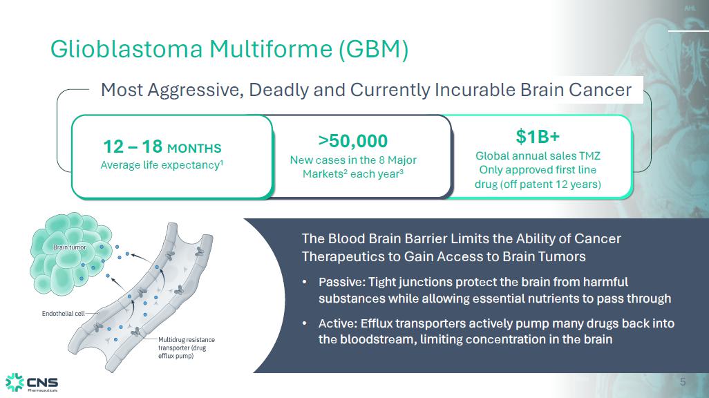 Glioblastoma Multiforme (GBM) The Blood Brain Barrier Limits the Ability of Cancer Therapeutics to Gain Access to Brain Tumors • Passive: Tight junctions protect the brain from harmful substances while allowing essential nutrients to pass through • Active: Efflux transporters actively pump many drugs back into the bloodstream, limiting concentration in the brain 12 – 18 MONTHS Average life expectancy 1 >50,000 New cases in the 8 Major Markets 2 each year 3 $1B+ Global annual sales TMZ Only approved first line drug (off patent 12 years) Most Aggressive, Deadly and Currently Incurable Brain Cancer 5