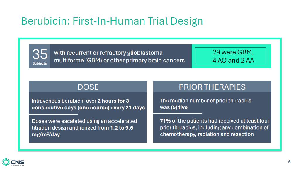 Berubicin: First - In - Human Trial Design with recurrent or refractory glioblastoma multiforme (GBM) or other primary brain cancers 29 were GBM, 4 AO and 2 AA 35 Subjects DOSE Intravenous berubicin over 2 hours for 3 consecutive days (one course) every 21 days Doses were escalated using an accelerated titration design and ranged from 1 . 2 to 9 . 6 mg/m 2 /day PRIOR THERAPIES The median number of prior therapies was (5) five 71 % of the patients had received at least four prior therapies, including any combination of chemotherapy, radiation and resection 6