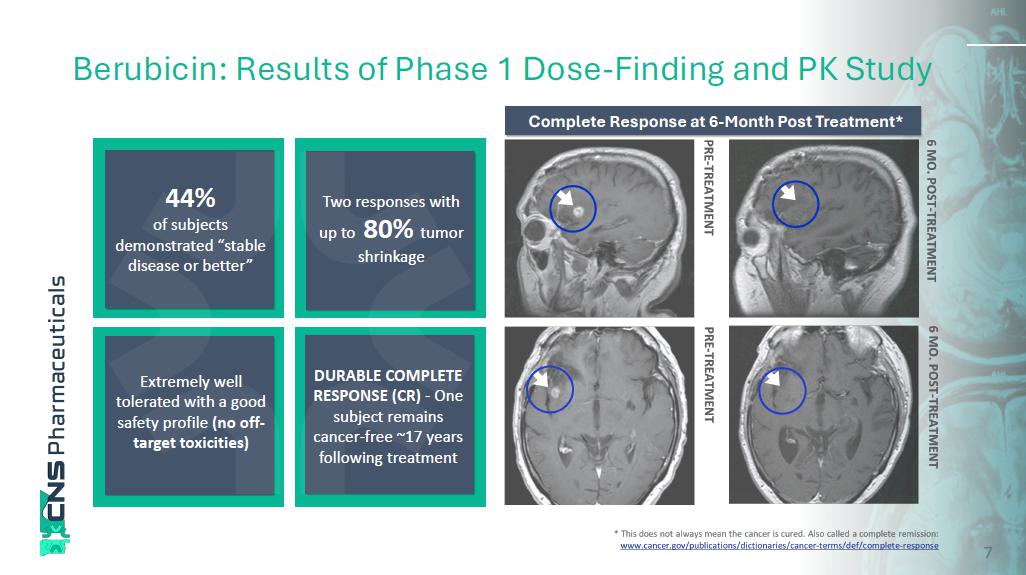 Berubicin: Results of Phase 1 Dose - Finding and PK Study 44% of subjects demonstrated “stable disease or better” Two responses with up to 80% tumor shrinkage Extremely well tolerated with a good safety profile (no off - target toxicities) DURABLE COMPLETE RESPONSE (CR) - One subject remains cancer - free ~17 years following treatment Complete Response at 6 - Month Post Treatment* 7