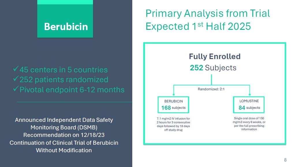 Primary Analysis from Trial Expected 1 st Half 2025 Announced Independent Data Safety Monitoring Board (DSMB) Recommendation on 12/18/23 Continuation of Clinical Trial of Berubicin Without Modification x 45 centers in 5 countries x 252 patients randomized x Pivotal endpoint 6 - 12 months Berubicin Fully Enrolled 252 Subjects BERUBICIN 168 subjects 8 LOMUSTINE 84 subjects Randomized: 2:1 7.1 mg/m2 IV infusion for 2 hours for 3 consecutive days followed by 18 days off study drug Single oral dose of 130 mg/m2 every 6 weeks, or per the full prescribing information