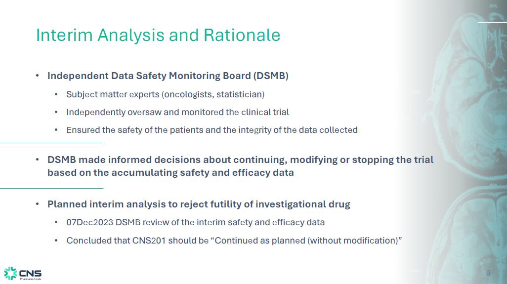Interim Analysis and Rationale • Independent Data Safety Monitoring Board (DSMB) • Subject matter experts (oncologists, statistician) • Independently oversaw and monitored the clinical trial • Ensured the safety of the patients and the integrity of the data collected • DSMB made informed decisions about continuing, modifying or stopping the trial based on the accumulating safety and efficacy data • Planned interim analysis to reject futility of investigational drug • 07Dec2023 DSMB review of the interim safety and efficacy data • Concluded that CNS201 should be “Continued as planned (without modification)” 9