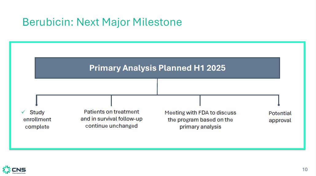 Berubicin: Next Major Milestone Primary Analysis Planned H1 2025 x Study enrollment complete 10 Patients on treatment and in survival follow - up continue unchanged Meeting with FDA to discuss the program based on the primary analysis Potential approval