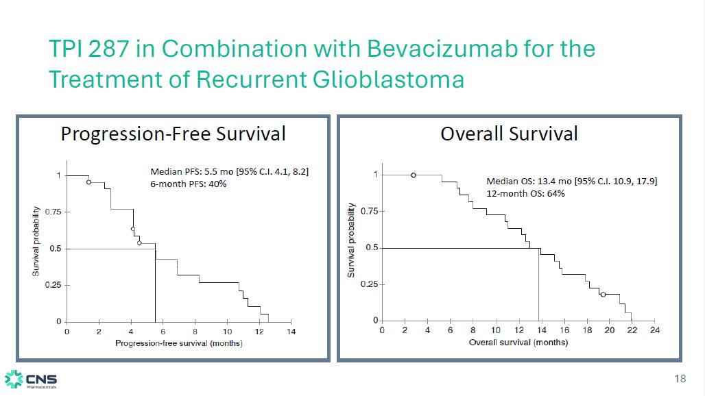 TPI 287 in Combination with Bevacizumab for the Treatment of Recurrent Glioblastoma Progression - Free Survival Overall Survival Median OS: 13.4 mo [95% C.I. 10.9, 17.9] 12 - month OS: 64% Median PFS: 5.5 mo [95% C.I. 4.1, 8.2] 6 - month PFS: 40% 18
