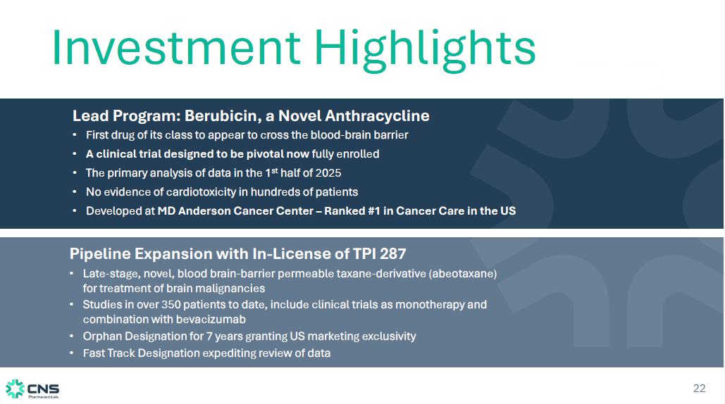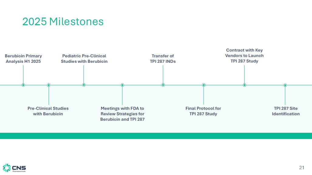 2025 Milestones Berubicin Primary Analysis H1 2025 Pediatric Pre - Clinical Studies with Berubicin Pre - Clinical Studies with Berubicin Meetings with FDA to Review Strategies for Berubicin and TPI 287 Contract with Key Vendors to Launch TPI 287 Study Transfer of TPI 287 INDs TPI 287 Site Identification Final Protocol for TPI 287 Study 21