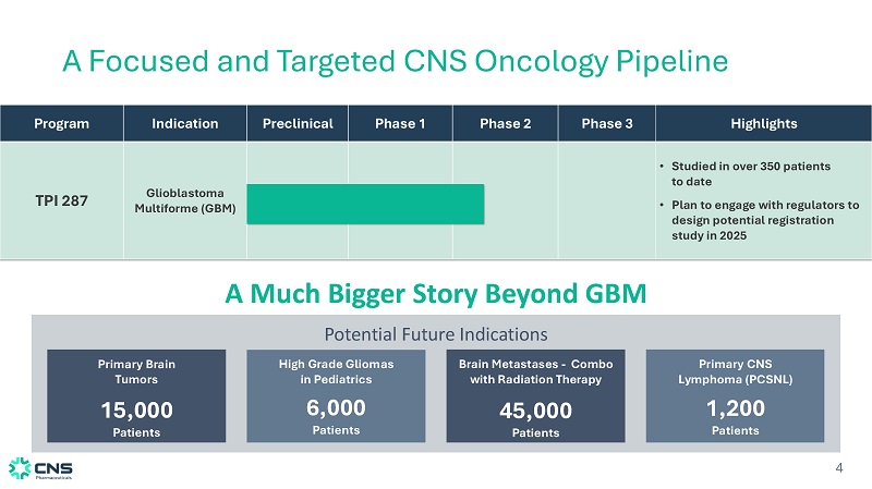 3 Overview Developing Anti - Cancer Drug Candidates for the Treatment of Primary and Metastatic Brain Cancers Strong Financial Position Proven Clinical Development "Engine" with Global Trial Site Network in Place to Accelerate Complex CNS Focused Trials Advancing Lead Product Candidate, TPI 287 for treatment of Glioblastoma Multiforme (GBM) • Late - stage, novel, blood brain - barrier permeable taxane - derivative (abeotaxane) • Studies in over 350 patients to date, include clinical trials as monotherapy and combination with bevacizumab Reported Primary Analysis of Berubicin Monotherapy in 2 nd line GBM • Ongoing analysis of outcomes ongoing to determine next steps 1. Did not a statistically significant difference in overall survival, the primary endpoint
