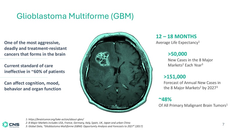 Proven Clinical Development Infrastructure Optimized for Brain Cancer Drug Development 6 Relationships • Deliberate establishment of a global, CNS focused network • Commitment to work in this disease • Deep understanding of the landscape of clinical trials in GBM Program Development Infrastructure & Efficiencies • Seamless transition to our next asset • Built to last • Set up for success