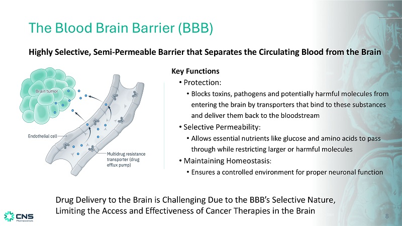 8 The Blood Brain Barrier (BBB) Highly Selective, Semi - Permeable Barrier that Separates the Circulating Blood from the Brain Key Functions • Protection: • Blocks toxins, pathogens and potentially harmful molecules from entering the brain by transporters that bind to these substances and deliver them back to the bloodstream • Selective Permeability : • Allows essential nutrients like glucose and amino acids to pass through while restricting larger or harmful molecules • Maintaining Homeostasis : • Ensures a controlled environment for proper neuronal function Drug Delivery to the Brain is Challenging Due to the BBB’s Selective Nature, Limiting the Access and Effectiveness of Cancer Therapies in the Brain