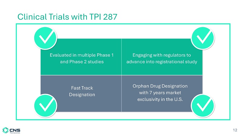 Clinical Trials with TPI 287 12 Evaluated in multiple Phase 1 and Phase 2 studies Engaging with regulators to advance into registrational study Fast Track Designation Orphan Drug Designation with 7 years market exclusivity in the U.S. ̭ ̭ ̭ ̭