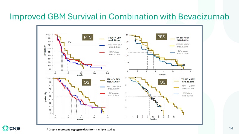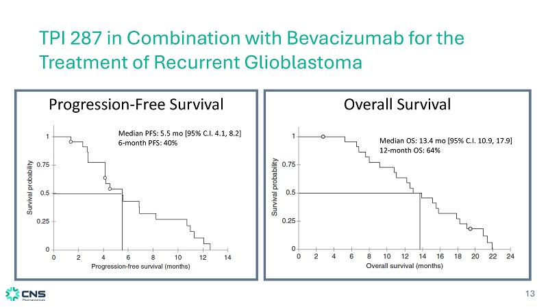 TPI 287 in Combination with Bevacizumab for the Treatment of Recurrent Glioblastoma 13 Progression - Free Survival Overall Survival Median OS: 13.4 mo [95% C.I. 10.9, 17.9] 12 - month OS: 64% Median PFS: 5.5 mo [95% C.I. 4.1, 8.2] 6 - month PFS: 40%