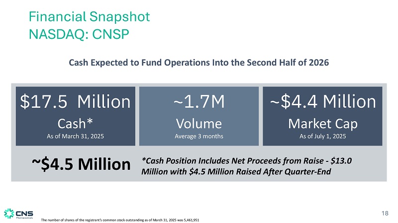Financial Snapshot NASDAQ: CNSP Cash Expected to Fund Operations Into the Second Half of 2026 18 $17.5 Million Cash* As of March 31, 2025 ~1.7M Volume Average 3 months ~$4.4 Million Market Cap As of July 1, 2025 The number of shares of the registrant’s common stock outstanding as of March 31, 2025 was 5,461,951 *Cash Position Includes Net Proceeds from Raise - $13.0 Million with $4.5 Million Raised After Quarter - End ~$4.5 Million