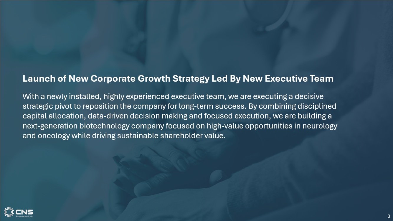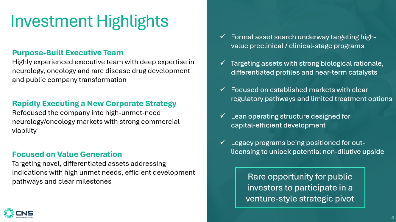3 Launch of New Corporate Growth Strategy Led By New Executive Team With a newly installed, highly experienced executive team, we are executing a decisive strategic pivot to reposition the company for long - term success. By combining disciplined capital allocation, data - driven decision making and focused execution, we are building a next - generation biotechnology company focused on high - value opportunities in neurology and oncology while driving sustainable shareholder value.