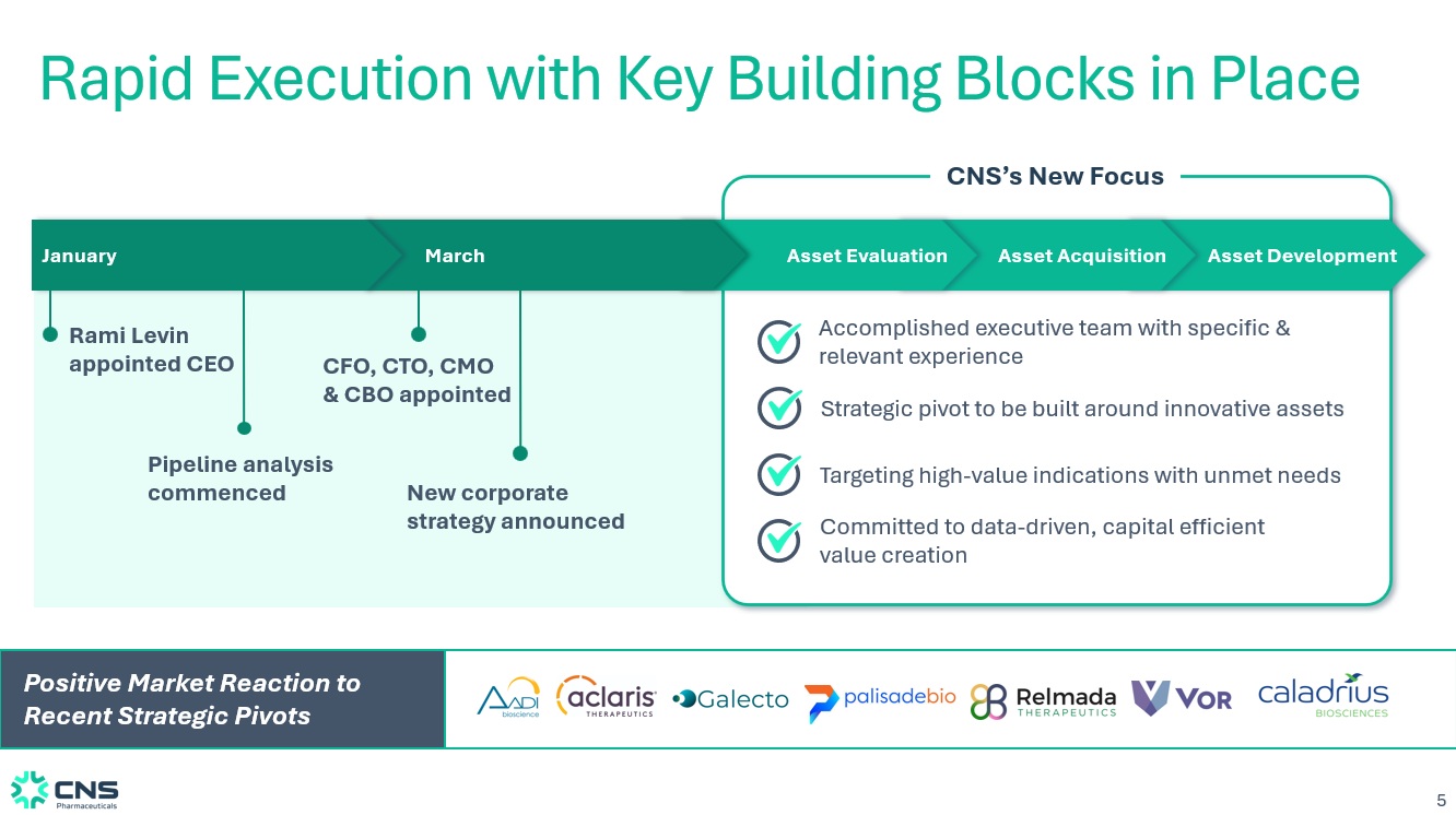 4 Investment Highlights x Formal asset search underway targeting high - value preclinical / clinical - stage programs Rapidly Executing a New Corporate Strategy Refocused the company into high - unmet - need neurology/oncology markets with strong commercial viability Purpose - Built Executive Team Highly experienced executive team with deep expertise in neurology, oncology and rare disease drug development and public company transformation x Focused on established markets with clear regulatory pathways and limited treatment options x Legacy programs being positioned for out - licensing to unlock potential non - dilutive upside Rare opportunity for public investors to participate in a venture - style strategic pivot x Lean operating structure designed for capital - efficient development x Targeting assets with strong biological rationale, differentiated profiles and near - term catalysts Focused on Value Generation Targeting novel, differentiated assets addressing indications with high unmet needs, efficient development pathways and clear milestones