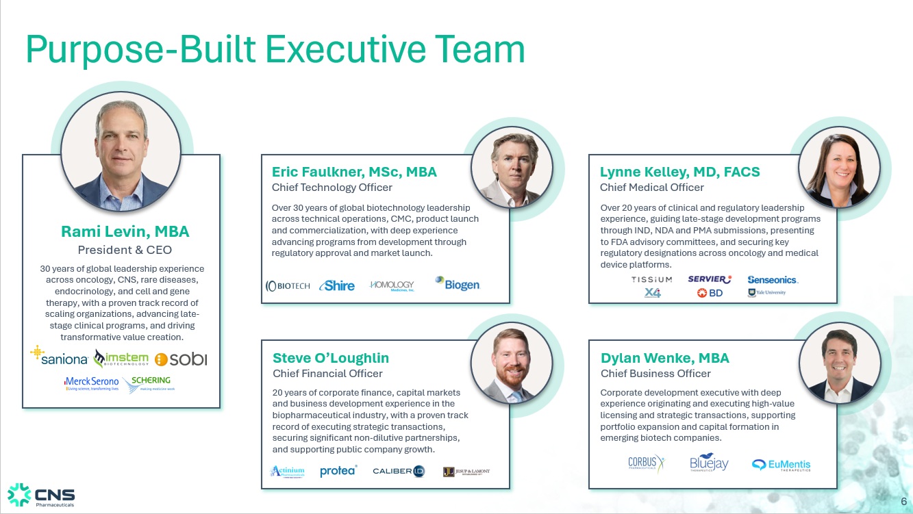 5 a Rapid Execution with Key Building Blocks in Place Accomplished executive team with specific & relevant experience Strategic pivot to be built around innovative assets Targeting high - value indications with unmet needs CNS’s New Focus Committed to data - driven, capital efficient value creation Asset Development Asset Acquisition Asset Evaluation March January Rami Levin appointed CEO Pipeline analysis commenced CFO, CTO, CMO & CBO appointed New corporate strategy announced Positive Market Reaction to Recent Strategic Pivots