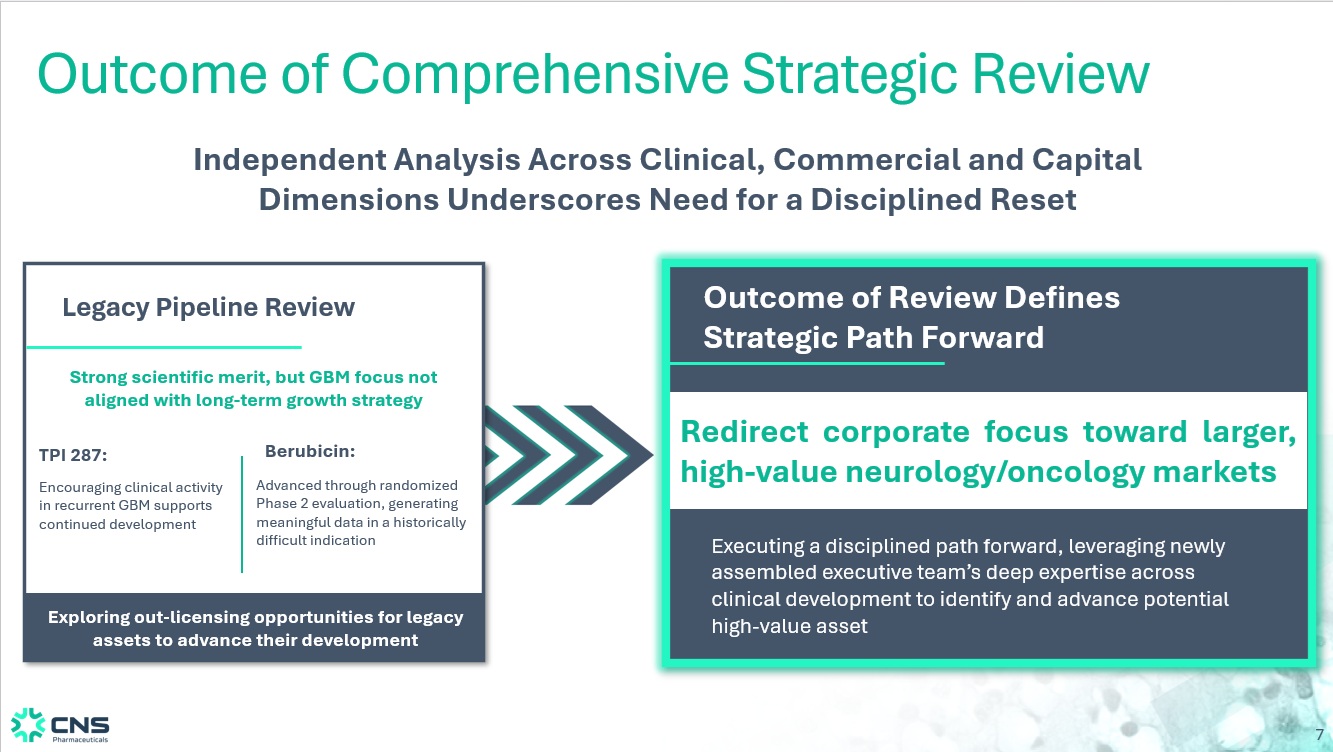 7 Outcome of Comprehensive Strategic Review Independent Analysis Across Clinical, Commercial and Capital Dimensions Underscores Need for a Disciplined Reset Legacy Pipeline Review Strong scientific merit, but GBM focus not aligned with long - term growth strategy Encouraging clinical activity in recurrent GBM supports continued development TPI 287: Advanced through randomized Phase 2 evaluation, generating meaningful data in a historically difficult indication Berubicin: Exploring out - licensing opportunities for legacy assets to advance their development Outcome of Review Defines Strategic Path Forward Executing a disciplined path forward, leveraging newly assembled executive team’s deep expertise across clinical development to identify and advance potential high - value asset Redirect corporate focus toward larger, high - value neurology/oncology markets