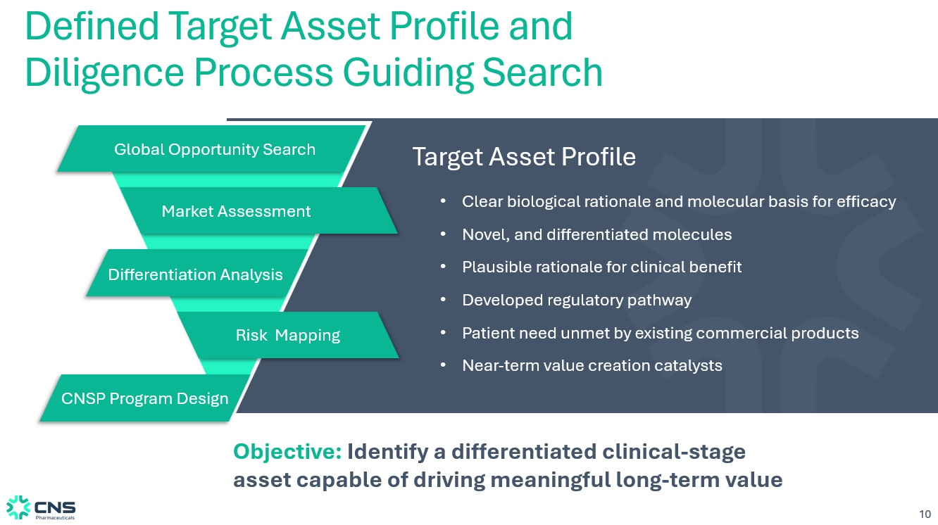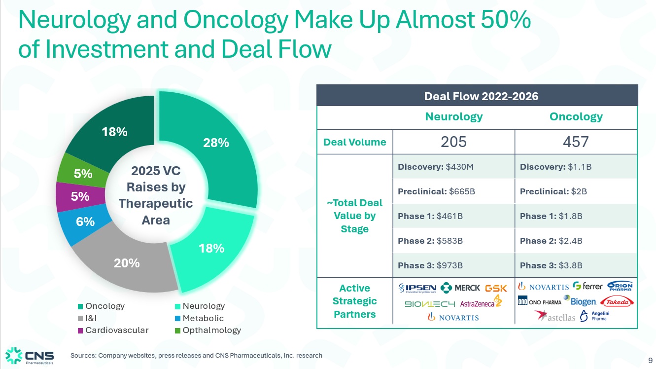 9 28% 18% 20% 6% 5% 5% 18% Oncology Neurology I&I Metabolic Cardiovascular Opthalmology Neurology and Oncology Make Up Almost 50% of Investment and Deal Flow Oncology Neurology 457 205 Deal Volume Discovery: $1.1B Discovery: $430M ~Total Deal Value by Stage Preclinical: $2B Preclinical: $665B Phase 1: $1.8B Phase 1: $461B Phase 2: $2.4B Phase 2: $583B Phase 3: $3.8B Phase 3: $973B Active Strategic Partners Deal Flow 2022 - 2026 Sources: Company websites, press releases and CNS Pharmaceuticals, Inc. research 2025 VC Raises by Therapeutic Area