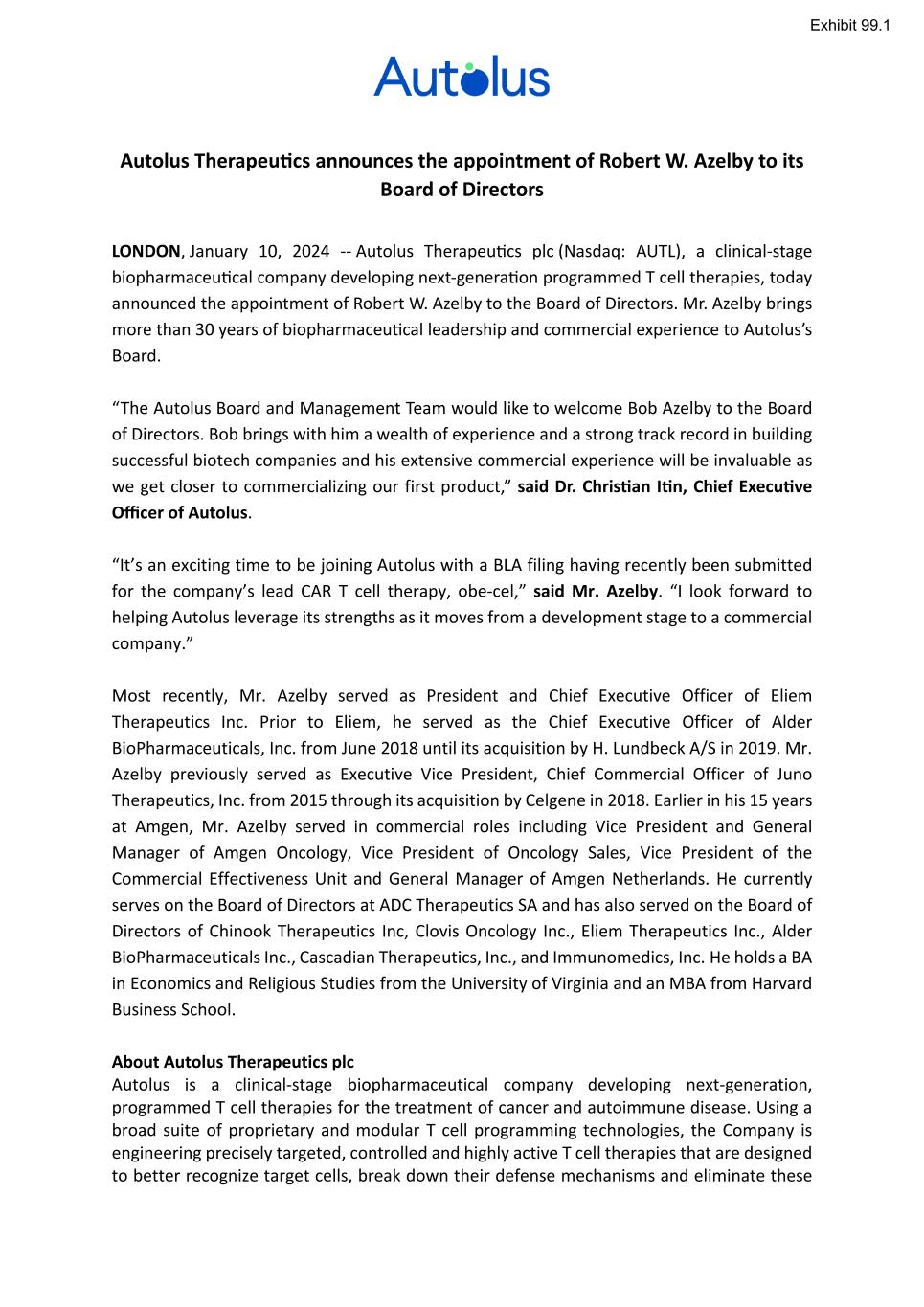 Autolus Therapeu�cs announces the appointment of Robert W. Azelby to its Board of Directors LONDON, January 10, 2024 -- Autolus Therapeu�cs plc (Nasdaq: AUTL), a clinical-stage biopharmaceu�cal company developing next-genera�on programmed T cell therapies, today announced the appointment of Robert W. Azelby to the Board of Directors. Mr. Azelby brings more than 30 years of biopharmaceu�cal leadership and commercial experience to Autolus’s Board. “The Autolus Board and Management Team would like to welcome Bob Azelby to the Board of Directors. Bob brings with him a wealth of experience and a strong track record in building successful biotech companies and his extensive commercial experience will be invaluable as we get closer to commercializing our first product,” said Dr. Chris�an I�n, Chief Execu�ve Officer of Autolus. “It’s an exciting time to be joining Autolus with a BLA filing having recently been submitted for the company’s lead CAR T cell therapy, obe-cel,” said Mr. Azelby. “I look forward to helping Autolus leverage its strengths as it moves from a development stage to a commercial company.” Most recently, Mr. Azelby served as President and Chief Executive Officer of Eliem Therapeutics Inc. Prior to Eliem, he served as the Chief Executive Officer of Alder BioPharmaceuticals, Inc. from June 2018 until its acquisition by H. Lundbeck A/S in 2019. Mr. Azelby previously served as Executive Vice President, Chief Commercial Officer of Juno Therapeutics, Inc. from 2015 through its acquisition by Celgene in 2018. Earlier in his 15 years at Amgen, Mr. Azelby served in commercial roles including Vice President and General Manager of Amgen Oncology, Vice President of Oncology Sales, Vice President of the Commercial Effectiveness Unit and General Manager of Amgen Netherlands. He currently serves on the Board of Directors at ADC Therapeutics SA and has also served on the Board of Directors of Chinook Therapeutics Inc, Clovis Oncology Inc., Eliem Therapeutics Inc., Alder BioPharmaceuticals Inc., Cascadian Therapeutics, Inc., and Immunomedics, Inc. He holds a BA in Economics and Religious Studies from the University of Virginia and an MBA from Harvard Business School. About Autolus Therapeutics plc Autolus is a clinical-stage biopharmaceutical company developing next-generation, programmed T cell therapies for the treatment of cancer and autoimmune disease. Using a broad suite of proprietary and modular T cell programming technologies, the Company is engineering precisely targeted, controlled and highly active T cell therapies that are designed to better recognize target cells, break down their defense mechanisms and eliminate these Exhibit 99.1
