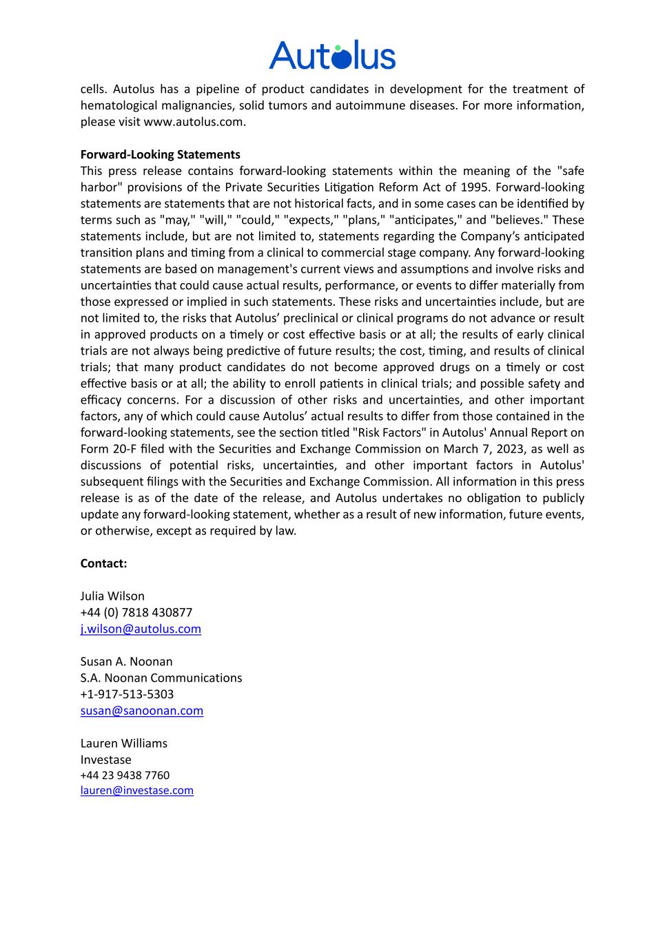 cells. Autolus has a pipeline of product candidates in development for the treatment of hematological malignancies, solid tumors and autoimmune diseases. For more information, please visit www.autolus.com. Forward-Looking Statements This press release contains forward-looking statements within the meaning of the "safe harbor" provisions of the Private Securi�es Li�ga�on Reform Act of 1995. Forward-looking statements are statements that are not historical facts, and in some cases can be iden�fied by terms such as "may," "will," "could," "expects," "plans," "an�cipates," and "believes." These statements include, but are not limited to, statements regarding the Company’s an�cipated transi�on plans and �ming from a clinical to commercial stage company. Any forward-looking statements are based on management's current views and assump�ons and involve risks and uncertain�es that could cause actual results, performance, or events to differ materially from those expressed or implied in such statements. These risks and uncertain�es include, but are not limited to, the risks that Autolus’ preclinical or clinical programs do not advance or result in approved products on a �mely or cost effec�ve basis or at all; the results of early clinical trials are not always being predic�ve of future results; the cost, �ming, and results of clinical trials; that many product candidates do not become approved drugs on a �mely or cost effec�ve basis or at all; the ability to enroll pa�ents in clinical trials; and possible safety and efficacy concerns. For a discussion of other risks and uncertain�es, and other important factors, any of which could cause Autolus’ actual results to differ from those contained in the forward-looking statements, see the sec�on �tled "Risk Factors" in Autolus' Annual Report on Form 20-F filed with the Securi�es and Exchange Commission on March 7, 2023, as well as discussions of poten�al risks, uncertain�es, and other important factors in Autolus' subsequent filings with the Securi�es and Exchange Commission. All informa�on in this press release is as of the date of the release, and Autolus undertakes no obliga�on to publicly update any forward-looking statement, whether as a result of new informa�on, future events, or otherwise, except as required by law. Contact: Julia Wilson +44 (0) 7818 430877 j.wilson@autolus.com Susan A. Noonan S.A. Noonan Communications +1-917-513-5303 susan@sanoonan.com Lauren Williams Investase +44 23 9438 7760 lauren@investase.com
