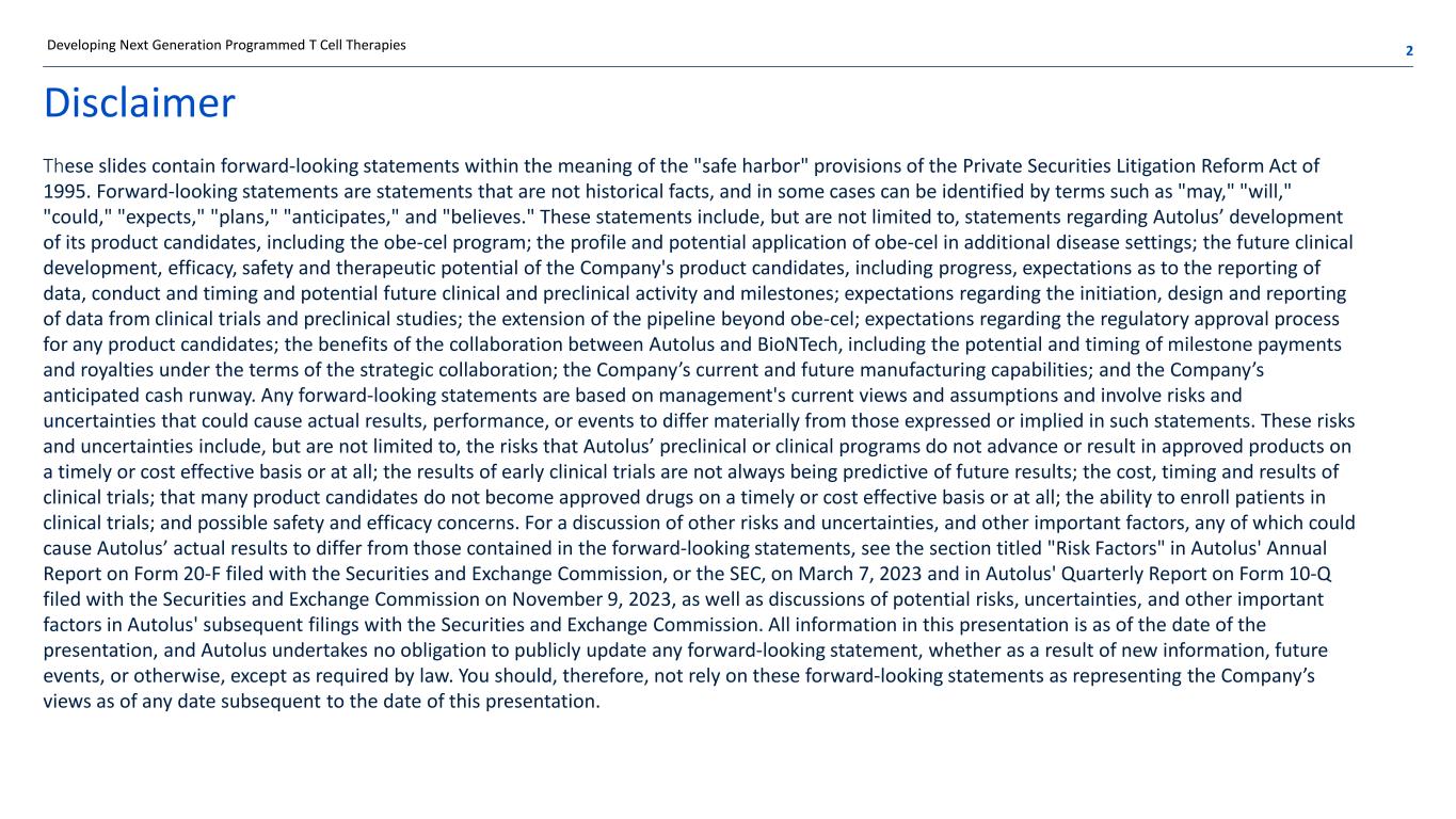 Disclaimer 2Developing Next Generation Programmed T Cell Therapies These slides contain forward-looking statements within the meaning of the "safe harbor" provisions of the Private Securities Litigation Reform Act of 1995. Forward-looking statements are statements that are not historical facts, and in some cases can be identified by terms such as "may," "will," "could," "expects," "plans," "anticipates," and "believes." These statements include, but are not limited to, statements regarding Autolus’ development of its product candidates, including the obe-cel program; the profile and potential application of obe-cel in additional disease settings; the future clinical development, efficacy, safety and therapeutic potential of the Company's product candidates, including progress, expectations as to the reporting of data, conduct and timing and potential future clinical and preclinical activity and milestones; expectations regarding the initiation, design and reporting of data from clinical trials and preclinical studies; the extension of the pipeline beyond obe-cel; expectations regarding the regulatory approval process for any product candidates; the benefits of the collaboration between Autolus and BioNTech, including the potential and timing of milestone payments and royalties under the terms of the strategic collaboration; the Company’s current and future manufacturing capabilities; and the Company’s anticipated cash runway. Any forward-looking statements are based on management's current views and assumptions and involve risks and uncertainties that could cause actual results, performance, or events to differ materially from those expressed or implied in such statements. These risks and uncertainties include, but are not limited to, the risks that Autolus’ preclinical or clinical programs do not advance or result in approved products on a timely or cost effective basis or at all; the results of early clinical trials are not always being predictive of future results; the cost, timing and results of clinical trials; that many product candidates do not become approved drugs on a timely or cost effective basis or at all; the ability to enroll patients in clinical trials; and possible safety and efficacy concerns. For a discussion of other risks and uncertainties, and other important factors, any of which could cause Autolus’ actual results to differ from those contained in the forward-looking statements, see the section titled "Risk Factors" in Autolus' Annual Report on Form 20-F filed with the Securities and Exchange Commission, or the SEC, on March 7, 2023 and in Autolus' Quarterly Report on Form 10-Q filed with the Securities and Exchange Commission on November 9, 2023, as well as discussions of potential risks, uncertainties, and other important factors in Autolus' subsequent filings with the Securities and Exchange Commission. All information in this presentation is as of the date of the presentation, and Autolus undertakes no obligation to publicly update any forward-looking statement, whether as a result of new information, future events, or otherwise, except as required by law. You should, therefore, not rely on these forward-looking statements as representing the Company’s views as of any date subsequent to the date of this presentation.
