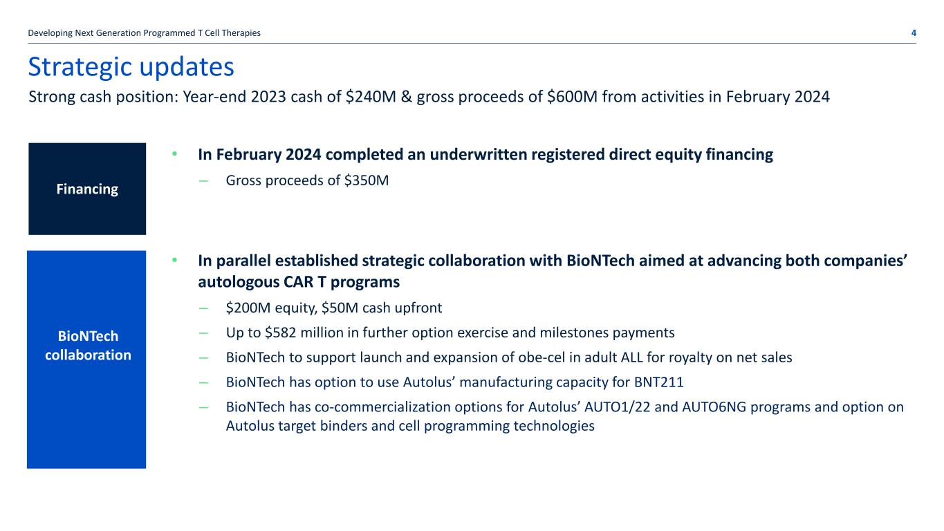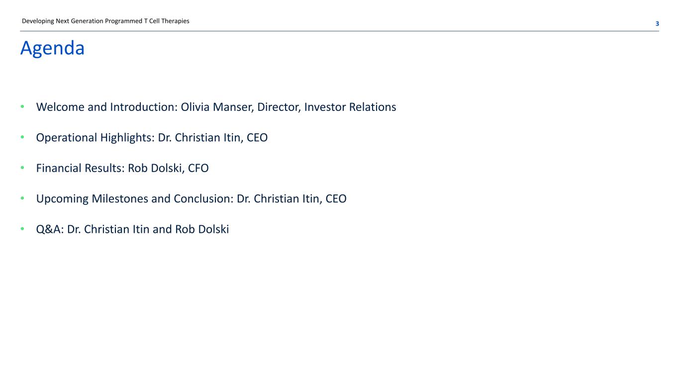 Agenda • Welcome and Introduction: Olivia Manser, Director, Investor Relations • Operational Highlights: Dr. Christian Itin, CEO • Financial Results: Rob Dolski, CFO • Upcoming Milestones and Conclusion: Dr. Christian Itin, CEO • Q&A: Dr. Christian Itin and Rob Dolski 3Developing Next Generation Programmed T Cell Therapies