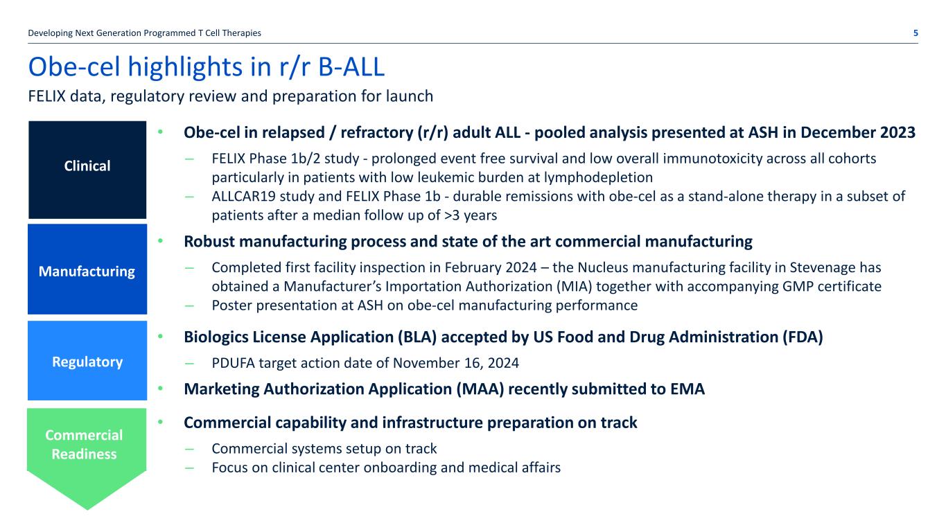 Strategic updates Developing Next Generation Programmed T Cell Therapies 4 Strong cash position: Year-end 2023 cash of $240M & gross proceeds of $600M from activities in February 2024 • In February 2024 completed an underwritten registered direct equity financing – Gross proceeds of $350M • In parallel established strategic collaboration with BioNTech aimed at advancing both companies’ autologous CAR T programs – $200M equity, $50M cash upfront – Up to $582 million in further option exercise and milestones payments – BioNTech to support launch and expansion of obe-cel in adult ALL for royalty on net sales – BioNTech has option to use Autolus’ manufacturing capacity for BNT211 – BioNTech has co-commercialization options for Autolus’ AUTO1/22 and AUTO6NG programs and option on Autolus target binders and cell programming technologies Financing BioNTech collaboration