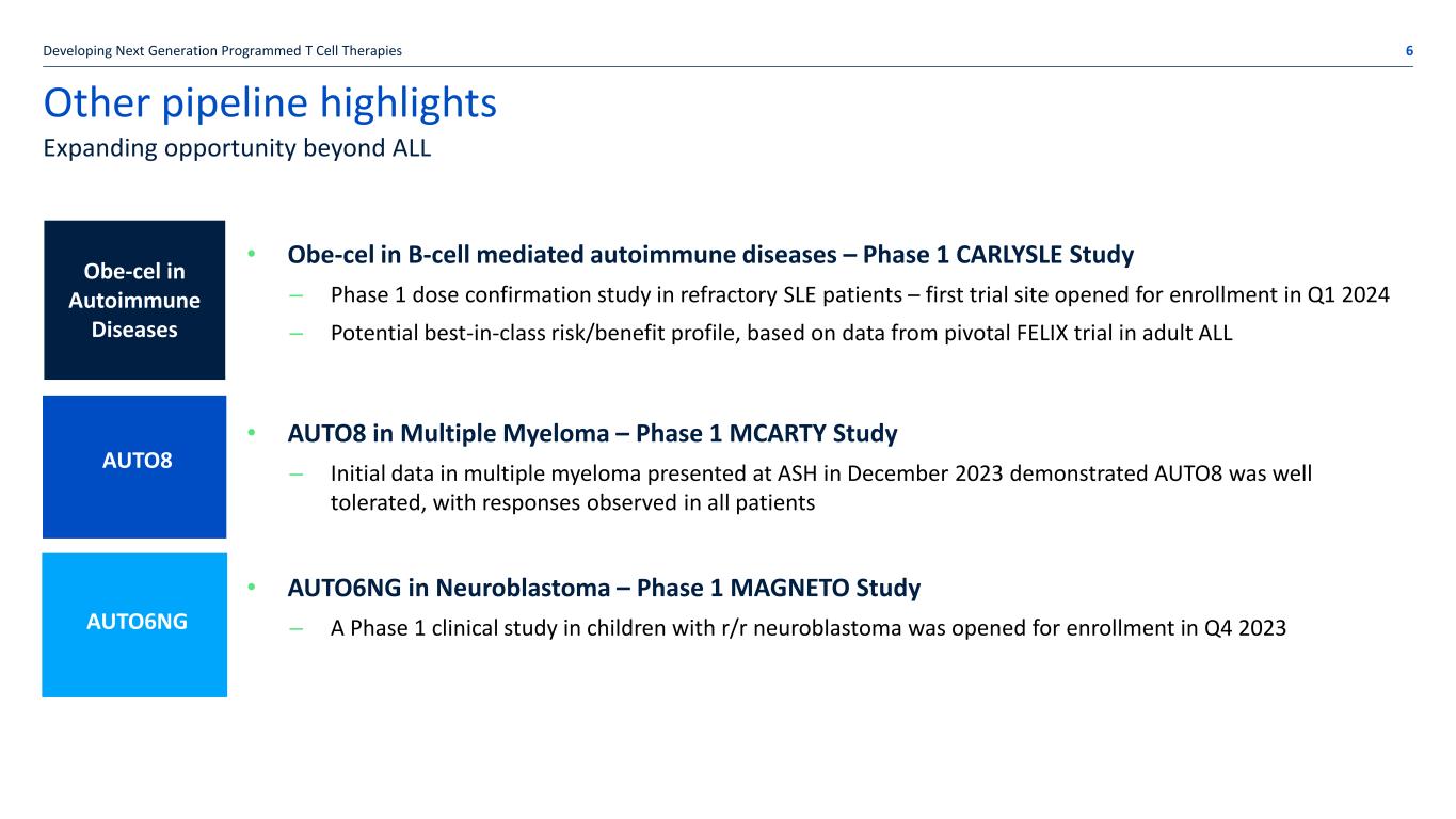 Obe-cel highlights in r/r B-ALL Developing Next Generation Programmed T Cell Therapies 5 FELIX data, regulatory review and preparation for launch • Obe-cel in relapsed / refractory (r/r) adult ALL - pooled analysis presented at ASH in December 2023 – FELIX Phase 1b/2 study - prolonged event free survival and low overall immunotoxicity across all cohorts particularly in patients with low leukemic burden at lymphodepletion – ALLCAR19 study and FELIX Phase 1b - durable remissions with obe-cel as a stand-alone therapy in a subset of patients after a median follow up of >3 years • Robust manufacturing process and state of the art commercial manufacturing – Completed first facility inspection in February 2024 – the Nucleus manufacturing facility in Stevenage has obtained a Manufacturer’s Importation Authorization (MIA) together with accompanying GMP certificate – Poster presentation at ASH on obe-cel manufacturing performance • Biologics License Application (BLA) accepted by US Food and Drug Administration (FDA) – PDUFA target action date of November 16, 2024 • Marketing Authorization Application (MAA) recently submitted to EMA • Commercial capability and infrastructure preparation on track – Commercial systems setup on track – Focus on clinical center onboarding and medical affairs Clinical Manufacturing Regulatory Commercial Readiness