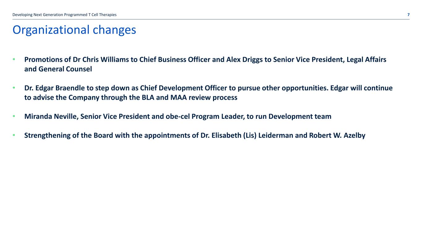 Organizational changes • Promotions of Dr Chris Williams to Chief Business Officer and Alex Driggs to Senior Vice President, Legal Affairs and General Counsel • Dr. Edgar Braendle to step down as Chief Development Officer to pursue other opportunities. Edgar will continue to advise the Company through the BLA and MAA review process • Miranda Neville, Senior Vice President and obe-cel Program Leader, to run Development team • Strengthening of the Board with the appointments of Dr. Elisabeth (Lis) Leiderman and Robert W. Azelby Developing Next Generation Programmed T Cell Therapies 7