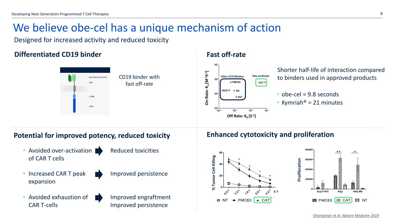 We believe obe-cel has a unique mechanism of action • Avoided over-activation of CAR T cells • Increased CAR T peak expansion • Avoided exhaustion of CAR T-cells 9 Enhanced cytotoxicity and proliferation Off Rate: Kd [S-1] ]1-S 1 - [M aK: e Ra t - On Other CD19 Binders Obe-cel Binder Off Rate: Kd [S-1] O n- Ra te : K a [M -1 S- 1 ] Shorter half-life of interaction compared to binders used in approved products • obe-cel = 9.8 seconds • Kymriah® = 21 minutes % T um or C el l K ill in g Pr ol ife ra tio n Ghorashian et al. Nature Medicine 2019 Fast off-rate CD19 binder with fast off-rate Designed for increased activity and reduced toxicity Developing Next Generation Programmed T Cell Therapies Differentiated CD19 binder Potential for improved potency, reduced toxicity Reduced toxicities Improved persistence Improved engraftment Improved persistence