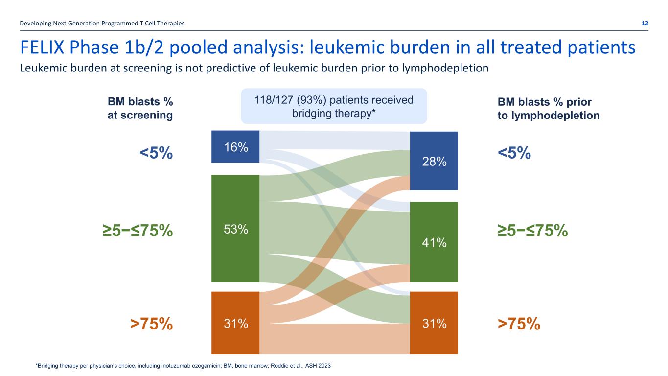 FELIX Phase 1b/2 pooled analysis: patient disposition Developing Next Generation Programmed T Cell Therapies 11 127/153 (83%) enrolled patients received obe-cel* Discontinued n (%) 26 (17) Death 15 (10) Manufacturing-related 7 (5) Adverse event 2 (1) Physician decision 1 (0.7) Progressive disease 1 (0.7) *Seven patients received Dose 1 only; **All eligibility criteria met and the leukapheresate accepted for manufacturing; obe-cel, obecabtagene autoleucel; Roddie et al., ASH 2023, Data cut-off date: September 13, 2023 Infused N = 127 (83%) Enrolled** N = 153 Cohort A n = 107 (84%) ≥5% BM blasts at screening Cohort B n = 13 (10%) MRD-positive at screening Cohort C n = 7 (6%) Isolated EMD at screening Morphologic disease*** (n = 98) • 74% of patients had CR/CRi (n = 73) • 95% of evaluated responders were MRD-negative‡ No morphologic disease (n = 29) • 100% of evaluable patients were MRD-negative§ ***Morphologic disease defined as ≥5% BM blasts or presence of EMD regardless of BM blast status; ‡MRD status available for 64/73 patients, as assessed by NGS or flow cytometry; §MRD status available for 27/29 patients, as assessed by NGS or flow cytometry; BM, bone marrow; CR, complete remission; CRi, CR with incomplete hematologic recovery; EMD, extramedullary disease; MRD, measurable residual disease; NGS, next-generation sequencing; obe-cel, obecabtagene autoleucel