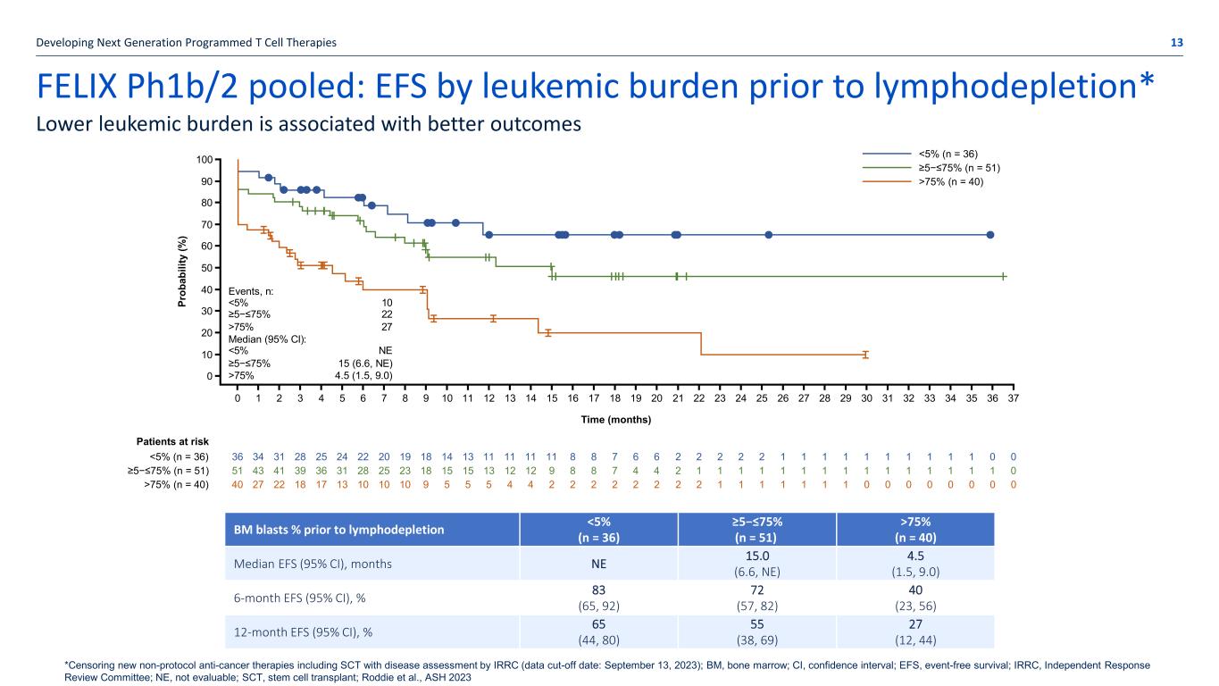 FELIX Phase 1b/2 pooled analysis: leukemic burden in all treated patients Developing Next Generation Programmed T Cell Therapies 12 Leukemic burden at screening is not predictive of leukemic burden prior to lymphodepletion *Bridging therapy per physician’s choice, including inotuzumab ozogamicin; BM, bone marrow; Roddie et al., ASH 2023 16% 28% 53% 40% 31% 31% BM blasts % at screening BM blasts % prior to lymphodepletion 118/127 (93%) patients received bridging therapy* <5% ≥5−≤75% >75% 53% 31% 31% <5% ≥5−≤75% >75% 28% 41% 16%