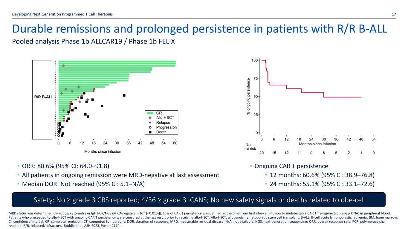 Long-term follow up in R/R B-ALL demonstrates favorable EFS and OS Developing Next Generation Programmed T Cell Therapies 16 Median follow up 36.5 months; pooled analysis Phase 1b ALLCAR19/Phase 1b FELIX *Censored for allo-HSCT and other anti-cancer treatment. Investigator-assessed disease evaluations were performed locally by CT and BM biopsy for B-ALL. Allo-HSCT, allogeneic hematopoietic stem cell transplant; B-ALL, B-cell acute lymphoblastic leukemia; BM, bone marrow; CI, confidence interval; CT, computed tomography; EFS, event-free survival; N/A, not available; obe-cel, obecabtagene autoleucel; OS, overall survival; R/R, relapsed/refractory. Roddie et al, ASH 2023, Poster 2114. Median OS: 16.4 months (95% CI: 7.1–N/A) 36-month OS rate: 41% (95% CI: 24–56) With censoring*: • Median EFS: 9.0 months (95% CI: 5.1–N/A) • 36-month EFS rate: 45% (95% CI: 27–62) Without censoring: • Median EFS: 9.6 months (95% CI: 5.1–N/A) • 36-month EFS rate: 36% (95% CI: 21–51)