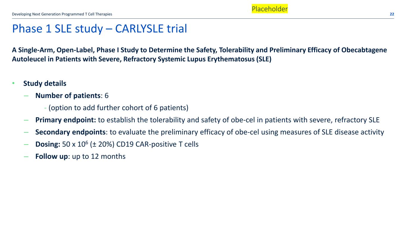 Phase 1 SLE study – CARLYSLE trial Developing Next Generation Programmed T Cell Therapies 22 A Single-Arm, Open-Label, Phase I Study to Determine the Safety, Tolerability and Preliminary Efficacy of Obecabtagene Autoleucel in Patients with Severe, Refractory Systemic Lupus Erythematosus (SLE) Placeholder • Study details – Number of patients: 6 - (option to add further cohort of 6 patients) – Primary endpoint: to establish the tolerability and safety of obe-cel in patients with severe, refractory SLE – Secondary endpoints: to evaluate the preliminary efficacy of obe-cel using measures of SLE disease activity – Dosing: 50 x 106 (± 20%) CD19 CAR-positive T cells – Follow up: up to 12 months 8 in Multiple Myeloma – Phase 1 MCARTY Study