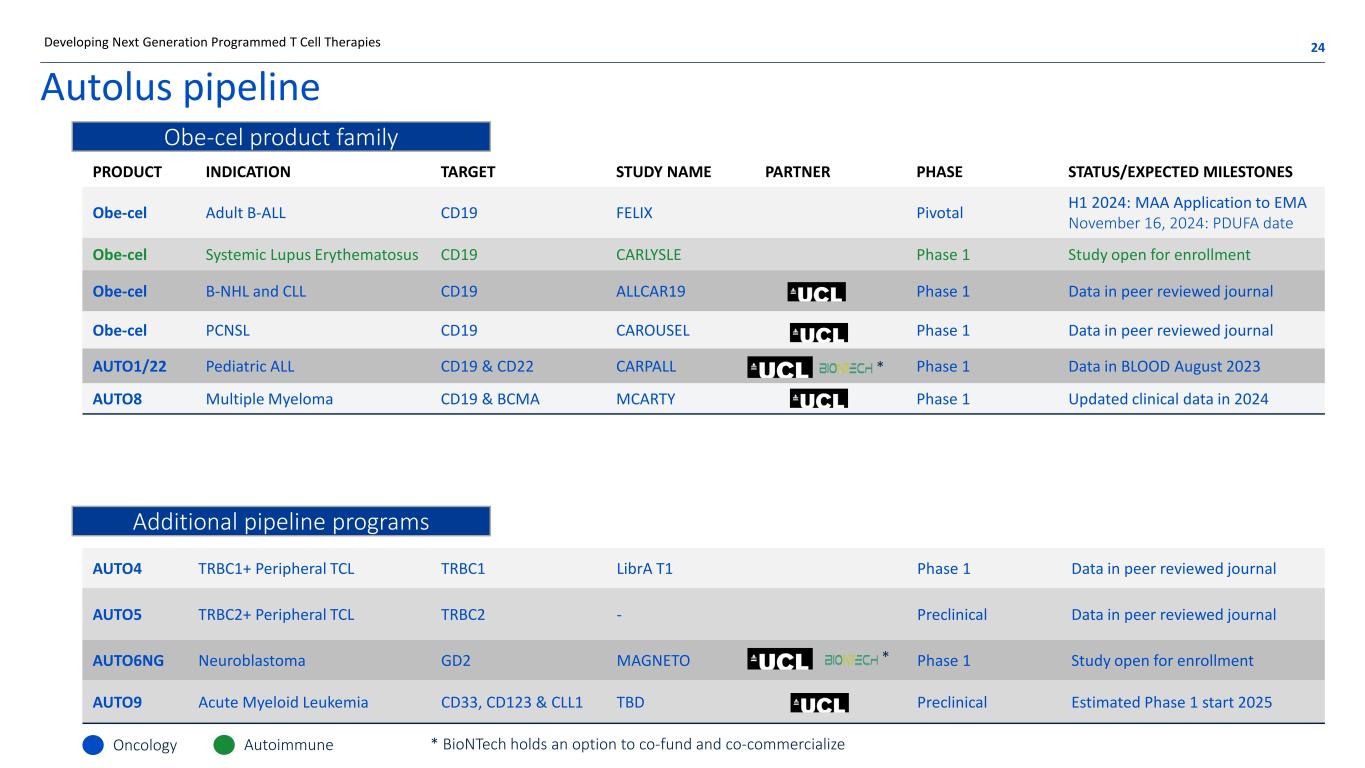 PRODUCT INDICATION TARGET STUDY NAME PARTNER PHASE STATUS/EXPECTED MILESTONES Obe-cel Adult B-ALL CD19 FELIX Pivotal H1 2024: MAA Application to EMA November 16, 2024: PDUFA date Obe-cel Systemic Lupus Erythematosus CD19 CARLYSLE Phase 1 Study open for enrollment Obe-cel B-NHL and CLL CD19 ALLCAR19 Phase 1 Data in peer reviewed journal Obe-cel PCNSL CD19 CAROUSEL Phase 1 Data in peer reviewed journal AUTO1/22 Pediatric ALL CD19 & CD22 CARPALL Phase 1 Data in BLOOD August 2023 AUTO8 Multiple Myeloma CD19 & BCMA MCARTY Phase 1 Updated clinical data in 2024 Autolus pipeline 24Developing Next Generation Programmed T Cell Therapies AUTO4 TRBC1+ Peripheral TCL TRBC1 LibrA T1 Phase 1 Data in peer reviewed journal AUTO5 TRBC2+ Peripheral TCL TRBC2 - Preclinical Data in peer reviewed journal AUTO6NG Neuroblastoma GD2 MAGNETO Phase 1 Study open for enrollment AUTO9 Acute Myeloid Leukemia CD33, CD123 & CLL1 TBD Preclinical Estimated Phase 1 start 2025 Oncology Autoimmune Obe-cel product family Additional pipeline programs * BioNTech holds an option to co-fund and co-commercialize * *