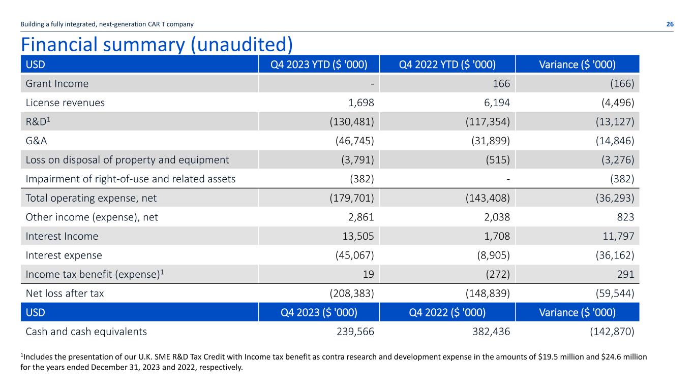 Financial summary (unaudited) USD Q4 2023 YTD ($ '000) Q4 2022 YTD ($ '000) Variance ($ '000) Grant Income - 166 (166) License revenues 1,698 6,194 (4,496) R&D1 (130,481) (117,354) (13,127) G&A (46,745) (31,899) (14,846) Loss on disposal of property and equipment (3,791) (515) (3,276) Impairment of right-of-use and related assets (382) - (382) Total operating expense, net (179,701) (143,408) (36,293) Other income (expense), net 2,861 2,038 823 Interest Income 13,505 1,708 11,797 Interest expense (45,067) (8,905) (36,162) Income tax benefit (expense)1 19 (272) 291 Net loss after tax (208,383) (148,839) (59,544) USD Q4 2023 ($ '000) Q4 2022 ($ '000) Variance ($ '000) Cash and cash equivalents 239,566 382,436 (142,870) Building a fully integrated, next-generation CAR T company 26 1Includes the presentation of our U.K. SME R&D Tax Credit with Income tax benefit as contra research and development expense in the amounts of $19.5 million and $24.6 million for the years ended December 31, 2023 and 2022, respectively.