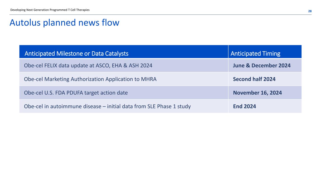 Autolus planned news flow 28Developing Next Generation Programmed T Cell Therapies Anticipated Milestone or Data Catalysts Anticipated Timing Obe-cel FELIX data update at ASCO, EHA & ASH 2024 June & December 2024 Obe-cel Marketing Authorization Application to MHRA Second half 2024 Obe-cel U.S. FDA PDUFA target action date November 16, 2024 Obe-cel in autoimmune disease – initial data from SLE Phase 1 study End 2024