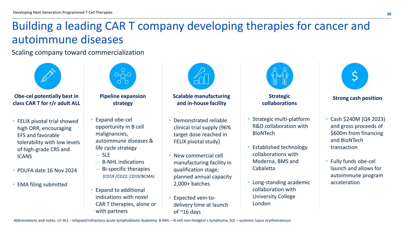 Building a leading CAR T company developing therapies for cancer and autoimmune diseases 30 • FELIX pivotal trial showed high ORR, encouraging EFS and favorable tolerability with low levels of high-grade CRS and ICANS • PDUFA date 16 Nov 2024 • EMA filing submitted • Strategic multi-platform R&D collaboration with BioNTech • Established technology collaborations with Moderna, BMS and Cabaletta • Long-standing academic collaboration with University College London • Expand obe-cel opportunity in B cell malignancies, autoimmune diseases & life cycle strategy – SLE – B-NHL indications – Bi-specific therapies (CD19 /CD22; CD19/BCMA) • Expand to additional indications with novel CAR T therapies, alone or with partners • Demonstrated reliable clinical trial supply (96% target dose reached in FELIX pivotal study) • New commercial cell manufacturing facility in qualification stage; planned annual capacity 2,000+ batches • Expected vein-to- delivery time at launch of ~16 days Obe-cel potentially best in class CAR T for r/r adult ALL Strategic collaborations Pipeline expansion strategy Scalable manufacturing and in-house facility • Cash $240M (Q4 2023) and gross proceeds of $600m from financing and BioNTech transaction • Fully funds obe-cel launch and allows for autoimmune program acceleration Strong cash position Scaling company toward commercialization $ Developing Next Generation Programmed T Cell Therapies Abbreviations and notes: r/r ALL - relapsed/refractory acute lymphoblastic leukemia; B-NHL – B-cell non-Hodgkin’s lymphoma; SLE – systemic lupus erythematosus.