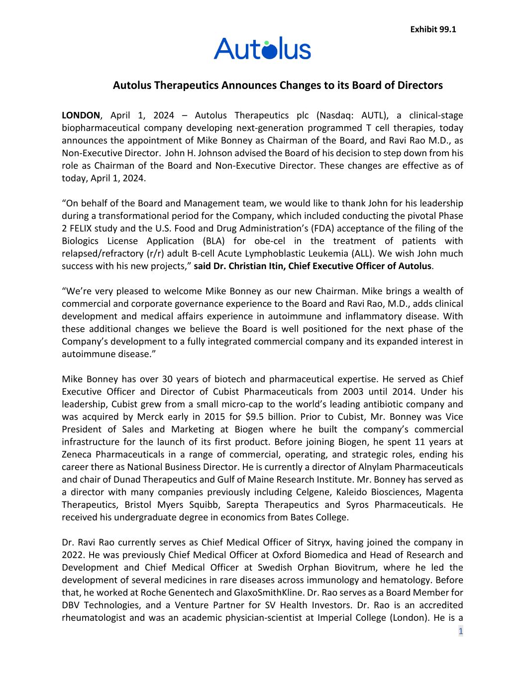 1 Autolus Therapeutics Announces Changes to its Board of Directors LONDON, April 1, 2024 – Autolus Therapeutics plc (Nasdaq: AUTL), a clinical-stage biopharmaceutical company developing next-generation programmed T cell therapies, today announces the appointment of Mike Bonney as Chairman of the Board, and Ravi Rao M.D., as Non-Executive Director. John H. Johnson advised the Board of his decision to step down from his role as Chairman of the Board and Non-Executive Director. These changes are effective as of today, April 1, 2024. “On behalf of the Board and Management team, we would like to thank John for his leadership during a transformational period for the Company, which included conducting the pivotal Phase 2 FELIX study and the U.S. Food and Drug Administration’s (FDA) acceptance of the filing of the Biologics License Application (BLA) for obe-cel in the treatment of patients with relapsed/refractory (r/r) adult B-cell Acute Lymphoblastic Leukemia (ALL). We wish John much success with his new projects,” said Dr. Christian Itin, Chief Executive Officer of Autolus. “We’re very pleased to welcome Mike Bonney as our new Chairman. Mike brings a wealth of commercial and corporate governance experience to the Board and Ravi Rao, M.D., adds clinical development and medical affairs experience in autoimmune and inflammatory disease. With these additional changes we believe the Board is well positioned for the next phase of the Company’s development to a fully integrated commercial company and its expanded interest in autoimmune disease.” Mike Bonney has over 30 years of biotech and pharmaceutical expertise. He served as Chief Executive Officer and Director of Cubist Pharmaceuticals from 2003 until 2014. Under his leadership, Cubist grew from a small micro-cap to the world’s leading antibiotic company and was acquired by Merck early in 2015 for $9.5 billion. Prior to Cubist, Mr. Bonney was Vice President of Sales and Marketing at Biogen where he built the company’s commercial infrastructure for the launch of its first product. Before joining Biogen, he spent 11 years at Zeneca Pharmaceuticals in a range of commercial, operating, and strategic roles, ending his career there as National Business Director. He is currently a director of Alnylam Pharmaceuticals and chair of Dunad Therapeutics and Gulf of Maine Research Institute. Mr. Bonney has served as a director with many companies previously including Celgene, Kaleido Biosciences, Magenta Therapeutics, Bristol Myers Squibb, Sarepta Therapeutics and Syros Pharmaceuticals. He received his undergraduate degree in economics from Bates College. Dr. Ravi Rao currently serves as Chief Medical Officer of Sitryx, having joined the company in 2022. He was previously Chief Medical Officer at Oxford Biomedica and Head of Research and Development and Chief Medical Officer at Swedish Orphan Biovitrum, where he led the development of several medicines in rare diseases across immunology and hematology. Before that, he worked at Roche Genentech and GlaxoSmithKline. Dr. Rao serves as a Board Member for DBV Technologies, and a Venture Partner for SV Health Investors. Dr. Rao is an accredited rheumatologist and was an academic physician-scientist at Imperial College (London). He is a Exhibit 99.1