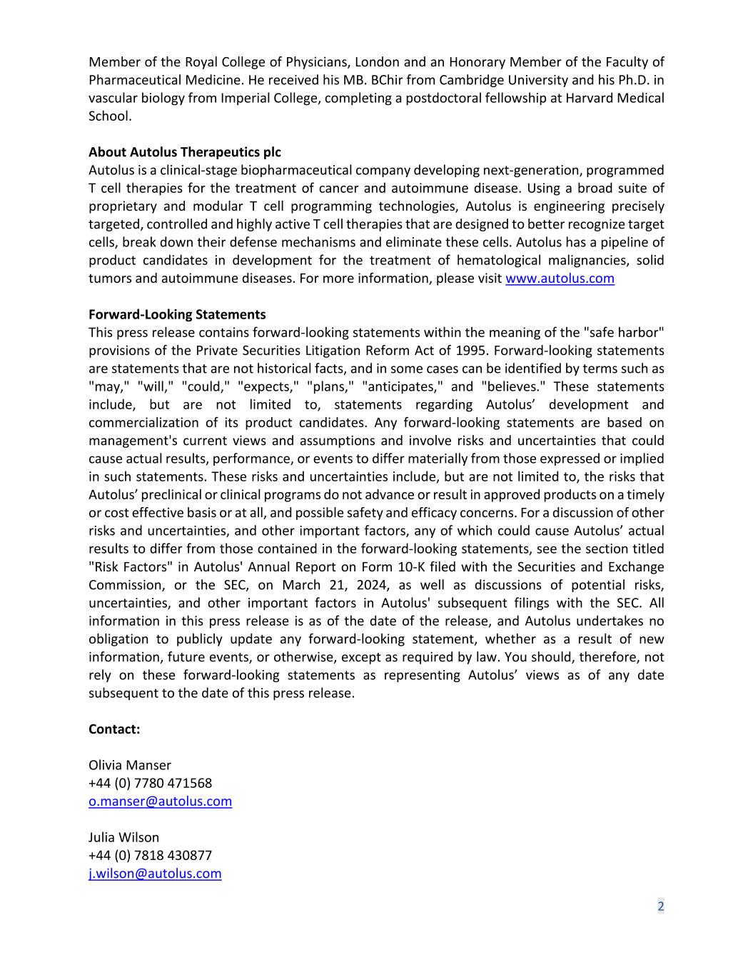 2 Member of the Royal College of Physicians, London and an Honorary Member of the Faculty of Pharmaceutical Medicine. He received his MB. BChir from Cambridge University and his Ph.D. in vascular biology from Imperial College, completing a postdoctoral fellowship at Harvard Medical School. About Autolus Therapeutics plc Autolus is a clinical-stage biopharmaceutical company developing next-generation, programmed T cell therapies for the treatment of cancer and autoimmune disease. Using a broad suite of proprietary and modular T cell programming technologies, Autolus is engineering precisely targeted, controlled and highly active T cell therapies that are designed to better recognize target cells, break down their defense mechanisms and eliminate these cells. Autolus has a pipeline of product candidates in development for the treatment of hematological malignancies, solid tumors and autoimmune diseases. For more information, please visit www.autolus.com Forward-Looking Statements This press release contains forward-looking statements within the meaning of the "safe harbor" provisions of the Private Securities Litigation Reform Act of 1995. Forward-looking statements are statements that are not historical facts, and in some cases can be identified by terms such as "may," "will," "could," "expects," "plans," "anticipates," and "believes." These statements include, but are not limited to, statements regarding Autolus’ development and commercialization of its product candidates. Any forward-looking statements are based on management's current views and assumptions and involve risks and uncertainties that could cause actual results, performance, or events to differ materially from those expressed or implied in such statements. These risks and uncertainties include, but are not limited to, the risks that Autolus’ preclinical or clinical programs do not advance or result in approved products on a timely or cost effective basis or at all, and possible safety and efficacy concerns. For a discussion of other risks and uncertainties, and other important factors, any of which could cause Autolus’ actual results to differ from those contained in the forward-looking statements, see the section titled "Risk Factors" in Autolus' Annual Report on Form 10-K filed with the Securities and Exchange Commission, or the SEC, on March 21, 2024, as well as discussions of potential risks, uncertainties, and other important factors in Autolus' subsequent filings with the SEC. All information in this press release is as of the date of the release, and Autolus undertakes no obligation to publicly update any forward-looking statement, whether as a result of new information, future events, or otherwise, except as required by law. You should, therefore, not rely on these forward-looking statements as representing Autolus’ views as of any date subsequent to the date of this press release. Contact: Olivia Manser +44 (0) 7780 471568 o.manser@autolus.com Julia Wilson +44 (0) 7818 430877 j.wilson@autolus.com