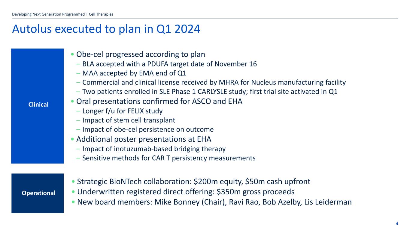 Disclaimer These slides contain forward-looking statements within the meaning of the “safe harbor” provisions of the Private Securities Litigation Reform Act of 1995. Forward-looking statements are statements that are not historical facts, and in some cases can be identified by terms such as “may,” “will,” “could,” “expects,” “plans,” “anticipates,” and “believes.” These statements include, but are not limited to, statements regarding Autolus’ development of its product candidates, including the obe-cel program; the profile and potential application of obe- cel in additional disease settings; the future clinical development, efficacy, safety and therapeutic potential of the Company’s product candidates, including progress, expectations as to the reporting of data, conduct and timing and potential future clinical and preclinical activity and milestones; expectations regarding the initiation, design and reporting of data from clinical trials and preclinical studies; the extension of the pipeline beyond obe-cel; expectations regarding the regulatory approval process for any product candidates; the benefits of the collaboration between Autolus and BioNTech, including the potential and timing of milestone payments and royalties under the terms of the strategic collaboration; the Company’s current and future manufacturing capabilities; and the Company’s anticipated cash runway. Any forward-looking statements are based on management’s current views and assumptions and involve risks and uncertainties that could cause actual results, performance, or events to differ materially from those expressed or implied in such statements. These risks and uncertainties include, but are not limited to, the risks that Autolus’ preclinical or clinical programs do not advance or result in approved products on a timely or cost effective basis or at all; the results of early clinical trials are not always being predictive of future results; the cost, timing and results of clinical trials; that many product candidates do not become approved drugs on a timely or cost effective basis or at all; the ability to enroll patients in clinical trials; and possible safety and efficacy concerns. For a discussion of other risks and uncertainties, and other important factors, any of which could cause Autolus’ actual results to differ from those contained in the forward-looking statements, see the section titled “Risk Factors” in Autolus' Annual Report on Form 10-K filed with the Securities and Exchange Commission, or the SEC, on March 21, 2024, as well as discussions of potential risks, uncertainties, and other important factors in Autolus’ subsequent filings with the Securities and Exchange Commission. All information in this presentation is as of the date of the presentation, and Autolus undertakes no obligation to publicly update any forward-looking statement, whether as a result of new information, future events, or otherwise, except as required by law. You should, therefore, not rely on these forward-looking statements as representing the Company’s views as of any date subsequent to the date of this presentation. Developing Next Generation Programmed T Cell Therapies 2