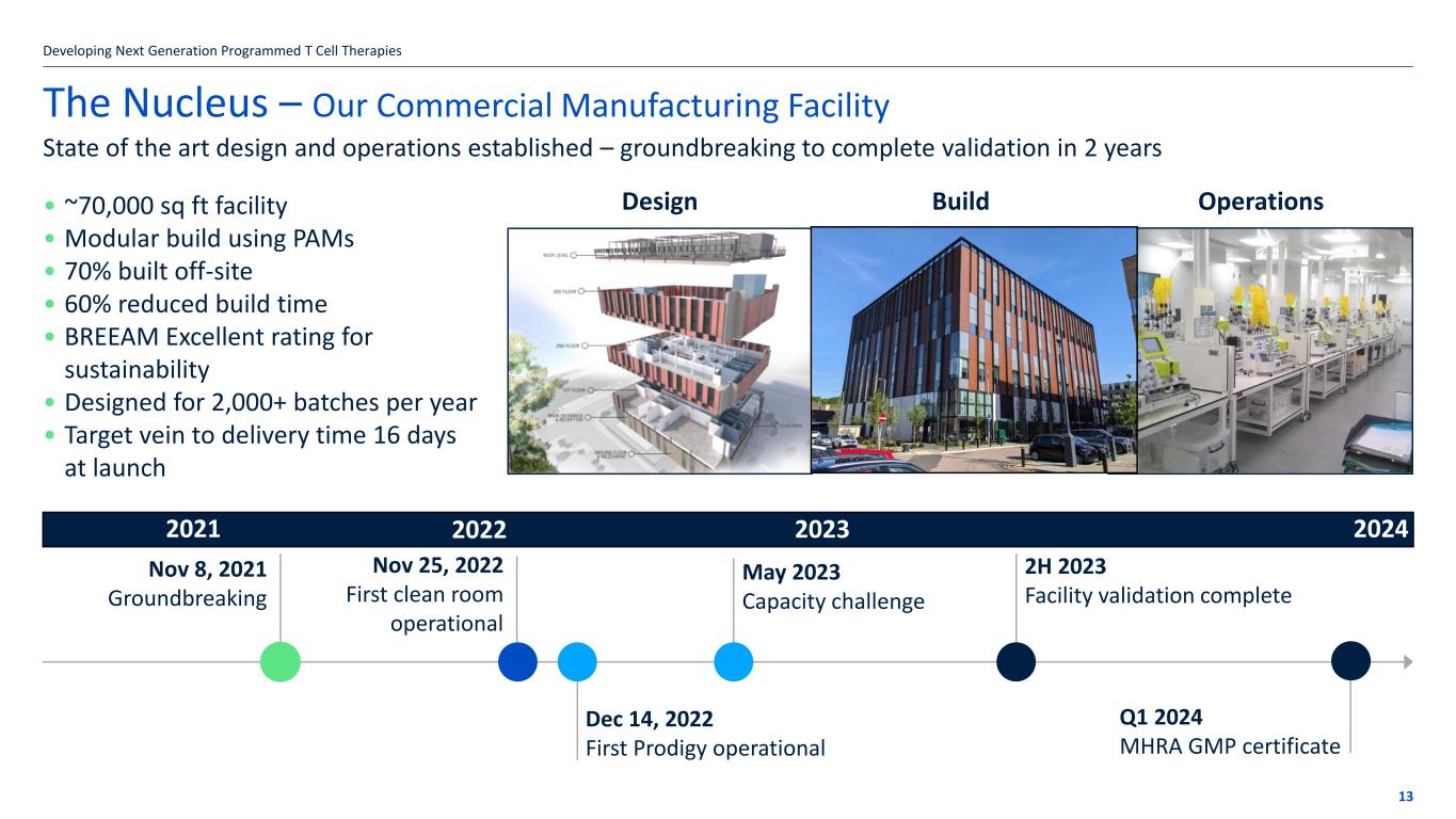 Commercial Readiness Obe-cel steps to commercialization 12 Roadmap to a commercial launch in r/r adult ALL Obe-cel BLA accepted by FDA Nucleus MHRA inspection & approval Obe-cel EMA MAA Developing Next Generation Programmed T Cell Therapies FDA PDUFA Target FDA Action Date November 16 Obtained MHRA MIA together with accompanying GMP certificate Q1 Q2 Q3 Q4 Medical affairs engagement Value and HEOR evidence generation US Center onboarding US supply chain, logistics and systems testing Obe-cel MHRA authorization application Filing of MHRA marketing authorization application (MAA) planned for H2 2024