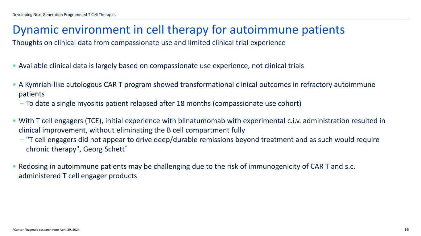 Dynamic environment in cell therapy for autoimmune patients Developing Next Generation Programmed T Cell Therapies 16 Thoughts on clinical data from compassionate use and limited clinical trial experience *Cantor Fitzgerald research note April 29, 2024 • Available clinical data is largely based on compassionate use experience, not clinical trials • A Kymriah-like autologous CAR T program showed transformational clinical outcomes in refractory autoimmune patients – To date a single myositis patient relapsed after 18 months (compassionate use cohort) • With T cell engagers (TCE), initial experience with blinatumomab with experimental c.i.v. administration resulted in clinical improvement, without eliminating the B cell compartment fully – "T cell engagers did not appear to drive deep/durable remissions beyond treatment and as such would require chronic therapy", Georg Schett* • Redosing in autoimmune patients may be challenging due to the risk of immunogenicity of CAR T and s.c. administered T cell engager products