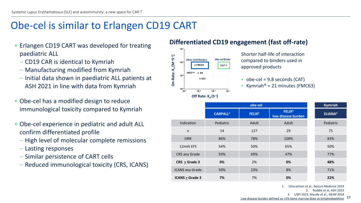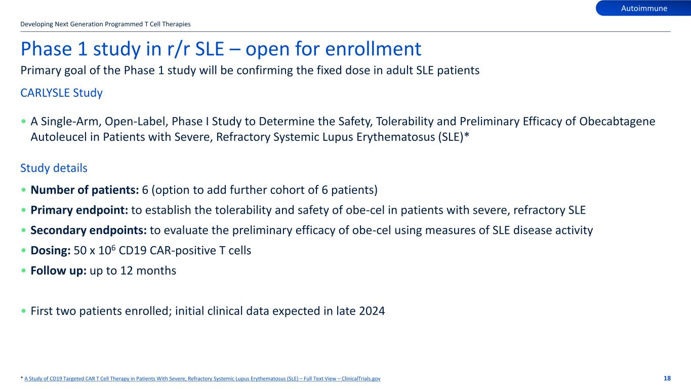 • Erlangen CD19 CART was developed for treating paediatric ALL – CD19 CAR is identical to Kymriah – Manufacturing modified from Kymriah – Initial data shown in paediatric ALL patients at ASH 2021 in line with data from Kymriah • Obe-cel has a modified design to reduce immunological toxicity compared to Kymriah • Obe-cel experience in pediatric and adult ALL confirm differentiated profile – High level of molecular complete remissions – Lasting responses – Similar persistence of CART cells – Reduced immunological toxicity (CRS, ICANS) 17 Systemic Lupus Erythematosus (SLE) and autoimmunity: a new space for CAR T Obe-cel is similar to Erlangen CD19 CART Differentiated CD19 engagement (fast off-rate) Off Rate: Kd [S-1] ]1 - S 1 - [M a K : e Ra t - On Other CD19 Binders Obe-cel Binder Off Rate: Kd [S-1] O n -R at e: K a [M -1 S- 1 ] Shorter half-life of interaction compared to binders used in approved products • obe-cel = 9.8 seconds (CAT) • Kymriah® = 21 minutes (FMC63) CARPALL1 FELIX2 FELIX2 low disease burden ELIANA3 Indication Pediatric Adult Adult Pediatric n 14 127 29 75 ORR 86% 78% 100% 83% 12mth EFS 54% 50% 65% 50% CRS any Grade 93% 69% 47% 77% CRS > Grade 3 0% 2% 0% 48% ICANS any Grade 50% 23% 8% 71% ICANS > Grade 3 7% 7% 0% 22% 1. Ghorashian et al., Nature Medicine 2019 2. Roddie et al, ASH 2023 3. USPI 2023, Maude et al., NEJM 2018 Low disease burden defined as <5% bone marrow blast at lymphodepletion obe-cel Kymriah