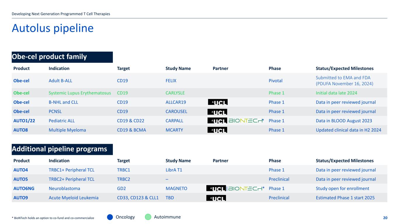 Phase 1 study in r/r SLE – open for enrollment CARLYSLE Study • A Single-Arm, Open-Label, Phase I Study to Determine the Safety, Tolerability and Preliminary Efficacy of Obecabtagene Autoleucel in Patients with Severe, Refractory Systemic Lupus Erythematosus (SLE)* Study details • Number of patients: 6 (option to add further cohort of 6 patients) • Primary endpoint: to establish the tolerability and safety of obe-cel in patients with severe, refractory SLE • Secondary endpoints: to evaluate the preliminary efficacy of obe-cel using measures of SLE disease activity • Dosing: 50 x 106 CD19 CAR-positive T cells • Follow up: up to 12 months • First two patients enrolled; initial clinical data expected in late 2024 Developing Next Generation Programmed T Cell Therapies 18 Primary goal of the Phase 1 study will be confirming the fixed dose in adult SLE patients * A Study of CD19 Targeted CAR T Cell Therapy in Patients With Severe, Refractory Systemic Lupus Erythematosus (SLE) – Full Text View – ClinicalTrials.gov Autoimmune