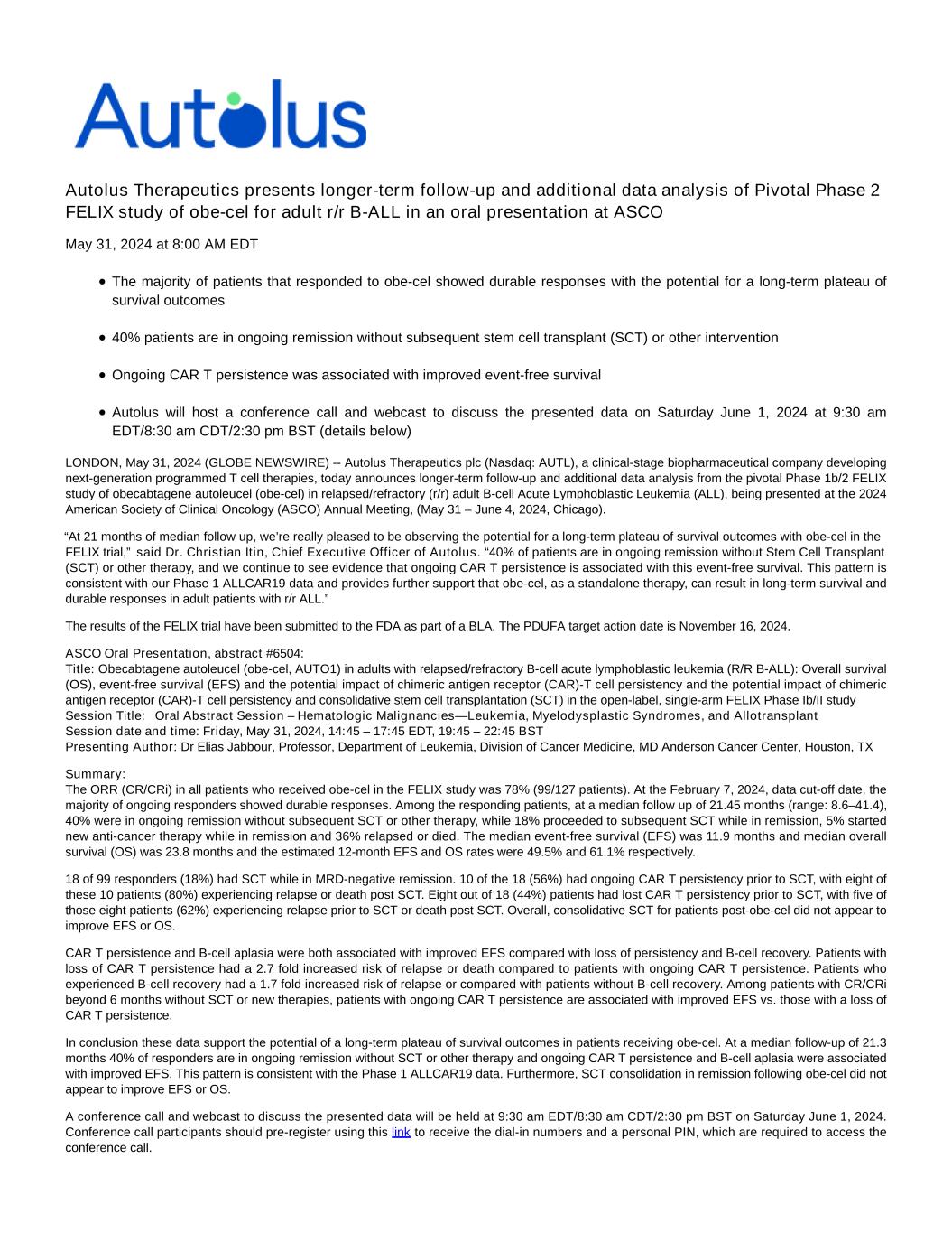 Autolus Therapeutics presents longer-term follow-up and additional data analysis of Pivotal Phase 2 FELIX study of obe-cel for adult r/r B-ALL in an oral presentation at ASCO May 31, 2024 at 8:00 AM EDT The majority of patients that responded to obe-cel showed durable responses with the potential for a long-term plateau of survival outcomes 40% patients are in ongoing remission without subsequent stem cell transplant (SCT) or other intervention Ongoing CAR T persistence was associated with improved event-free survival Autolus will host a conference call and webcast to discuss the presented data on Saturday June 1, 2024 at 9:30 am EDT/8:30 am CDT/2:30 pm BST (details below) LONDON, May 31, 2024 (GLOBE NEWSWIRE) -- Autolus Therapeutics plc (Nasdaq: AUTL), a clinical-stage biopharmaceutical company developing next-generation programmed T cell therapies, today announces longer-term follow-up and additional data analysis from the pivotal Phase 1b/2 FELIX study of obecabtagene autoleucel (obe-cel) in relapsed/refractory (r/r) adult B-cell Acute Lymphoblastic Leukemia (ALL), being presented at the 2024 American Society of Clinical Oncology (ASCO) Annual Meeting, (May 31 – June 4, 2024, Chicago). “At 21 months of median follow up, we’re really pleased to be observing the potential for a long-term plateau of survival outcomes with obe-cel in the FELIX trial,” said Dr. Christian Itin, Chief Executive Officer of Autolus. “40% of patients are in ongoing remission without Stem Cell Transplant (SCT) or other therapy, and we continue to see evidence that ongoing CAR T persistence is associated with this event-free survival. This pattern is consistent with our Phase 1 ALLCAR19 data and provides further support that obe-cel, as a standalone therapy, can result in long-term survival and durable responses in adult patients with r/r ALL.” The results of the FELIX trial have been submitted to the FDA as part of a BLA. The PDUFA target action date is November 16, 2024. ASCO Oral Presentation, abstract #6504: Title: Obecabtagene autoleucel (obe-cel, AUTO1) in adults with relapsed/refractory B-cell acute lymphoblastic leukemia (R/R B-ALL): Overall survival (OS), event-free survival (EFS) and the potential impact of chimeric antigen receptor (CAR)-T cell persistency and the potential impact of chimeric antigen receptor (CAR)-T cell persistency and consolidative stem cell transplantation (SCT) in the open-label, single-arm FELIX Phase Ib/II study Session Title:   Oral Abstract Session – Hematologic Malignancies—Leukemia, Myelodysplastic Syndromes, and Allotransplant Session date and time: Friday, May 31, 2024, 14:45 – 17:45 EDT, 19:45 – 22:45 BST Presenting Author: Dr Elias Jabbour, Professor, Department of Leukemia, Division of Cancer Medicine, MD Anderson Cancer Center, Houston, TX Summary: The ORR (CR/CRi) in all patients who received obe-cel in the FELIX study was 78% (99/127 patients). At the February 7, 2024, data cut-off date, the majority of ongoing responders showed durable responses. Among the responding patients, at a median follow up of 21.45 months (range: 8.6–41.4), 40% were in ongoing remission without subsequent SCT or other therapy, while 18% proceeded to subsequent SCT while in remission, 5% started new anti-cancer therapy while in remission and 36% relapsed or died. The median event-free survival (EFS) was 11.9 months and median overall survival (OS) was 23.8 months and the estimated 12-month EFS and OS rates were 49.5% and 61.1% respectively. 18 of 99 responders (18%) had SCT while in MRD-negative remission. 10 of the 18 (56%) had ongoing CAR T persistency prior to SCT, with eight of these 10 patients (80%) experiencing relapse or death post SCT. Eight out of 18 (44%) patients had lost CAR T persistency prior to SCT, with five of those eight patients (62%) experiencing relapse prior to SCT or death post SCT. Overall, consolidative SCT for patients post-obe-cel did not appear to improve EFS or OS. CAR T persistence and B-cell aplasia were both associated with improved EFS compared with loss of persistency and B-cell recovery. Patients with loss of CAR T persistence had a 2.7 fold increased risk of relapse or death compared to patients with ongoing CAR T persistence. Patients who experienced B-cell recovery had a 1.7 fold increased risk of relapse or compared with patients without B-cell recovery. Among patients with CR/CRi beyond 6 months without SCT or new therapies, patients with ongoing CAR T persistence are associated with improved EFS vs. those with a loss of CAR T persistence. In conclusion these data support the potential of a long-term plateau of survival outcomes in patients receiving obe-cel. At a median follow-up of 21.3 months 40% of responders are in ongoing remission without SCT or other therapy and ongoing CAR T persistence and B-cell aplasia were associated with improved EFS. This pattern is consistent with the Phase 1 ALLCAR19 data. Furthermore, SCT consolidation in remission following obe-cel did not appear to improve EFS or OS. A conference call and webcast to discuss the presented data will be held at 9:30 am EDT/8:30 am CDT/2:30 pm BST on Saturday June 1, 2024. Conference call participants should pre-register using this link to receive the dial-in numbers and a personal PIN, which are required to access the conference call.