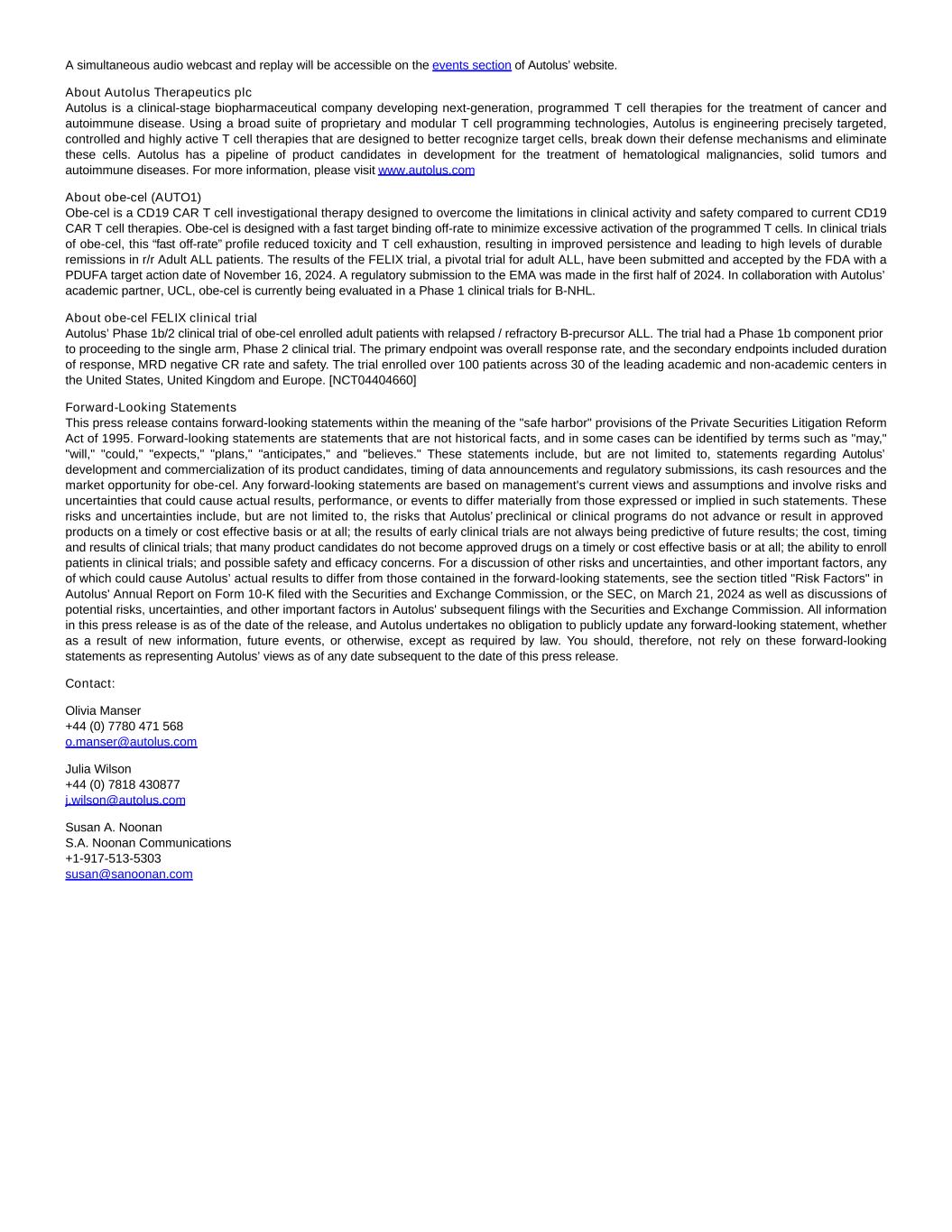 A simultaneous audio webcast and replay will be accessible on the events section of Autolus’ website. About Autolus Therapeutics plc Autolus is a clinical-stage biopharmaceutical company developing next-generation, programmed T cell therapies for the treatment of cancer and autoimmune disease. Using a broad suite of proprietary and modular T cell programming technologies, Autolus is engineering precisely targeted, controlled and highly active T cell therapies that are designed to better recognize target cells, break down their defense mechanisms and eliminate these cells. Autolus has a pipeline of product candidates in development for the treatment of hematological malignancies, solid tumors and autoimmune diseases. For more information, please visit www.autolus.com About obe-cel (AUTO1) Obe-cel is a CD19 CAR T cell investigational therapy designed to overcome the limitations in clinical activity and safety compared to current CD19 CAR T cell therapies. Obe-cel is designed with a fast target binding off-rate to minimize excessive activation of the programmed T cells. In clinical trials of obe-cel, this “fast off-rate” profile reduced toxicity and T cell exhaustion, resulting in improved persistence and leading to high levels of durable remissions in r/r Adult ALL patients. The results of the FELIX trial, a pivotal trial for adult ALL, have been submitted and accepted by the FDA with a PDUFA target action date of November 16, 2024. A regulatory submission to the EMA was made in the first half of 2024. In collaboration with Autolus’ academic partner, UCL, obe-cel is currently being evaluated in a Phase 1 clinical trials for B-NHL. About obe-cel FELIX clinical trial Autolus’ Phase 1b/2 clinical trial of obe-cel enrolled adult patients with relapsed / refractory B-precursor ALL. The trial had a Phase 1b component prior to proceeding to the single arm, Phase 2 clinical trial. The primary endpoint was overall response rate, and the secondary endpoints included duration of response, MRD negative CR rate and safety. The trial enrolled over 100 patients across 30 of the leading academic and non-academic centers in the United States, United Kingdom and Europe. [NCT04404660] Forward-Looking Statements This press release contains forward-looking statements within the meaning of the "safe harbor" provisions of the Private Securities Litigation Reform Act of 1995. Forward-looking statements are statements that are not historical facts, and in some cases can be identified by terms such as "may," "will," "could," "expects," "plans," "anticipates," and "believes." These statements include, but are not limited to, statements regarding Autolus’ development and commercialization of its product candidates, timing of data announcements and regulatory submissions, its cash resources and the market opportunity for obe-cel. Any forward-looking statements are based on management's current views and assumptions and involve risks and uncertainties that could cause actual results, performance, or events to differ materially from those expressed or implied in such statements. These risks and uncertainties include, but are not limited to, the risks that Autolus’ preclinical or clinical programs do not advance or result in approved products on a timely or cost effective basis or at all; the results of early clinical trials are not always being predictive of future results; the cost, timing and results of clinical trials; that many product candidates do not become approved drugs on a timely or cost effective basis or at all; the ability to enroll patients in clinical trials; and possible safety and efficacy concerns. For a discussion of other risks and uncertainties, and other important factors, any of which could cause Autolus’ actual results to differ from those contained in the forward-looking statements, see the section titled "Risk Factors" in Autolus' Annual Report on Form 10-K filed with the Securities and Exchange Commission, or the SEC, on March 21, 2024 as well as discussions of potential risks, uncertainties, and other important factors in Autolus' subsequent filings with the Securities and Exchange Commission. All information in this press release is as of the date of the release, and Autolus undertakes no obligation to publicly update any forward-looking statement, whether as a result of new information, future events, or otherwise, except as required by law. You should, therefore, not rely on these forward-looking statements as representing Autolus’ views as of any date subsequent to the date of this press release.  Contact: Olivia Manser +44 (0) 7780 471 568 o.manser@autolus.com Julia Wilson +44 (0) 7818 430877 j.wilson@autolus.com Susan A. Noonan S.A. Noonan Communications +1-917-513-5303 susan@sanoonan.com
