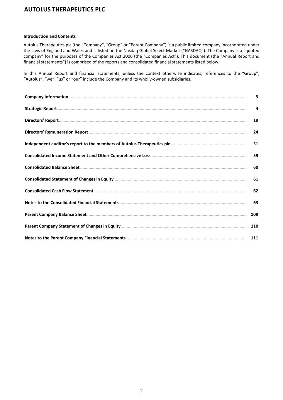 Introduction and Contents Autolus Therapeutics plc (the “Company”, “Group” or “Parent Company”) is a public limited company incorporated under the laws of England and Wales and is listed on the Nasdaq Global Select Market (“NASDAQ”). The Company is a “quoted company” for the purposes of the Companies Act 2006 (the “Companies Act”). This document (the “Annual Report and financial statements”) is comprised of the reports and consolidated financial statements listed below. In this Annual Report and financial statements, unless the context otherwise indicates, references to the “Group”, “Autolus”, “we”, “us” or “our” include the Company and its wholly-owned subsidiaries. Company Information ...................................................................................................................................................... 3 Strategic Report ............................................................................................................................................................... 4 Directors’ Report .............................................................................................................................................................. 19 Directors’ Remuneration Report ..................................................................................................................................... 24 Independent auditor’s report to the members of Autolus Therapeutics plc ................................................................ 51 Consolidated Income Statement and Other Comprehensive Loss ................................................................................ 59 Consolidated Balance Sheet ............................................................................................................................................ 60 Consolidated Statement of Changes in Equity ............................................................................................................... 61 Consolidated Cash Flow Statement ................................................................................................................................ 62 Notes to the Consolidated Financial Statements ........................................................................................................... 63 Parent Company Balance Sheet ...................................................................................................................................... 109 Parent Company Statement of Changes in Equity .......................................................................................................... 110 Notes to the Parent Company Financial Statements ..................................................................................................... 111 AUTOLUS THERAPEUTICS PLC 2