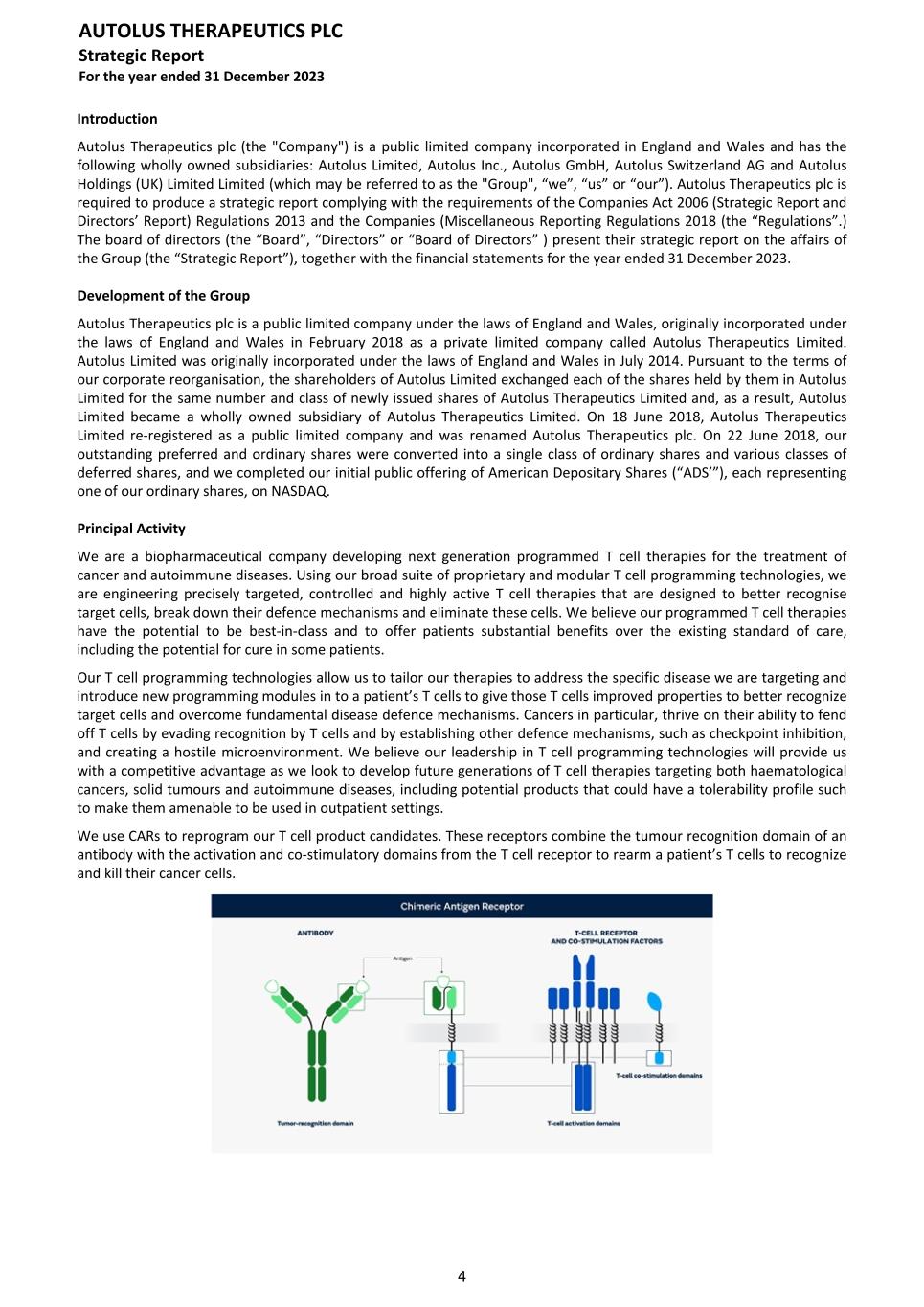 Introduction Autolus Therapeutics plc (the "Company") is a public limited company incorporated in England and Wales and has the following wholly owned subsidiaries: Autolus Limited, Autolus Inc., Autolus GmbH, Autolus Switzerland AG and Autolus Holdings (UK) Limited Limited (which may be referred to as the "Group", “we”, “us” or “our”). Autolus Therapeutics plc is required to produce a strategic report complying with the requirements of the Companies Act 2006 (Strategic Report and Directors’ Report) Regulations 2013 and the Companies (Miscellaneous Reporting Regulations 2018 (the “Regulations”.) The board of directors (the “Board”, “Directors” or “Board of Directors” ) present their strategic report on the affairs of the Group (the “Strategic Report”), together with the financial statements for the year ended 31 December 2023. Development of the Group Autolus Therapeutics plc is a public limited company under the laws of England and Wales, originally incorporated under the laws of England and Wales in February 2018 as a private limited company called Autolus Therapeutics Limited. Autolus Limited was originally incorporated under the laws of England and Wales in July 2014. Pursuant to the terms of our corporate reorganisation, the shareholders of Autolus Limited exchanged each of the shares held by them in Autolus Limited for the same number and class of newly issued shares of Autolus Therapeutics Limited and, as a result, Autolus Limited became a wholly owned subsidiary of Autolus Therapeutics Limited. On 18 June 2018, Autolus Therapeutics Limited re-registered as a public limited company and was renamed Autolus Therapeutics plc. On 22 June 2018, our outstanding preferred and ordinary shares were converted into a single class of ordinary shares and various classes of deferred shares, and we completed our initial public offering of American Depositary Shares (“ADS’”), each representing one of our ordinary shares, on NASDAQ. Principal Activity We are a biopharmaceutical company developing next generation programmed T cell therapies for the treatment of cancer and autoimmune diseases. Using our broad suite of proprietary and modular T cell programming technologies, we are engineering precisely targeted, controlled and highly active T cell therapies that are designed to better recognise target cells, break down their defence mechanisms and eliminate these cells. We believe our programmed T cell therapies have the potential to be best-in-class and to offer patients substantial benefits over the existing standard of care, including the potential for cure in some patients. Our T cell programming technologies allow us to tailor our therapies to address the specific disease we are targeting and introduce new programming modules in to a patient’s T cells to give those T cells improved properties to better recognize target cells and overcome fundamental disease defence mechanisms. Cancers in particular, thrive on their ability to fend off T cells by evading recognition by T cells and by establishing other defence mechanisms, such as checkpoint inhibition, and creating a hostile microenvironment. We believe our leadership in T cell programming technologies will provide us with a competitive advantage as we look to develop future generations of T cell therapies targeting both haematological cancers, solid tumours and autoimmune diseases, including potential products that could have a tolerability profile such to make them amenable to be used in outpatient settings. We use CARs to reprogram our T cell product candidates. These receptors combine the tumour recognition domain of an antibody with the activation and co-stimulatory domains from the T cell receptor to rearm a patient’s T cells to recognize and kill their cancer cells. AUTOLUS THERAPEUTICS PLC Strategic Report For the year ended 31 December 2023 4