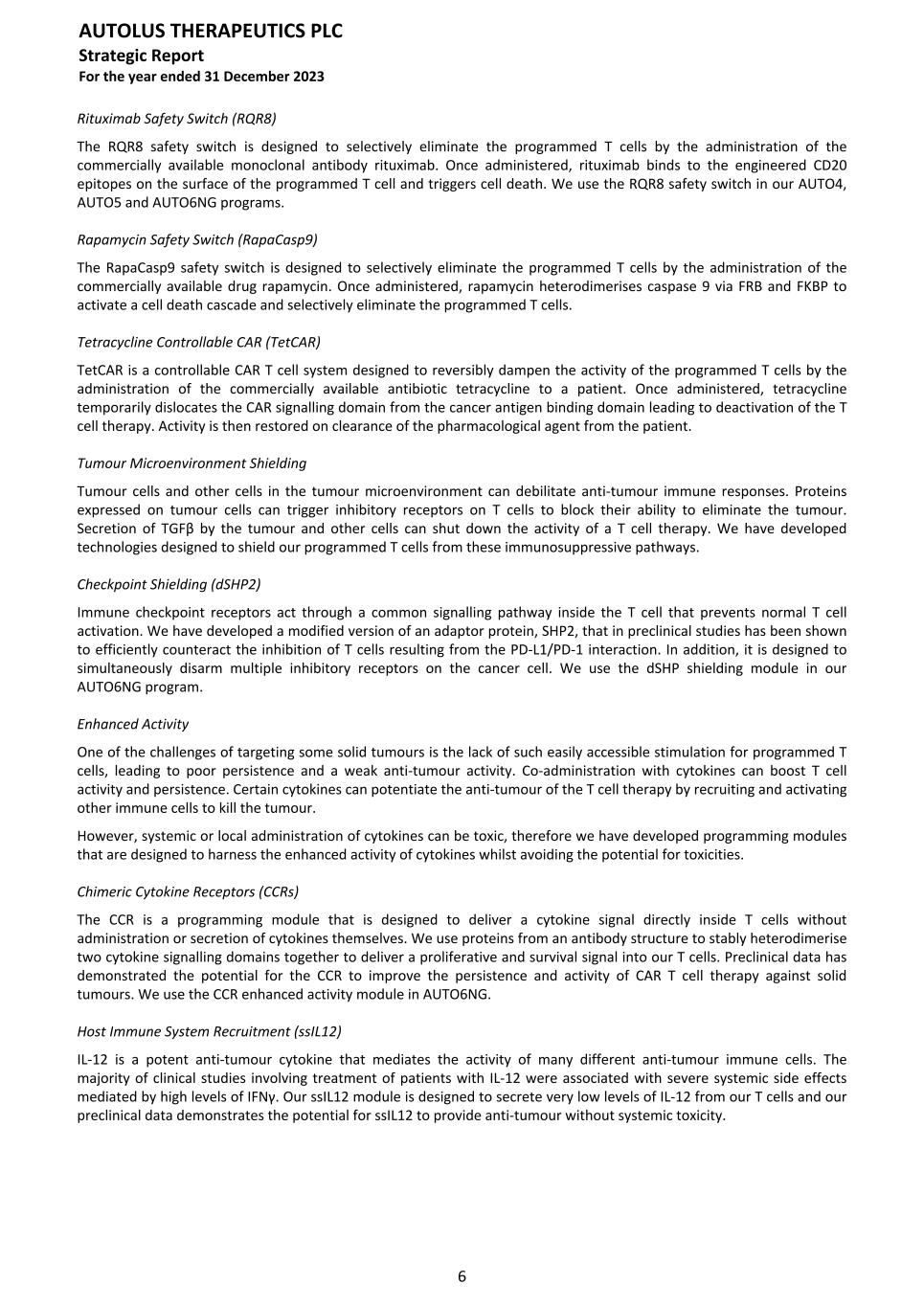 Rituximab Safety Switch (RQR8) The RQR8 safety switch is designed to selectively eliminate the programmed T cells by the administration of the commercially available monoclonal antibody rituximab. Once administered, rituximab binds to the engineered CD20 epitopes on the surface of the programmed T cell and triggers cell death. We use the RQR8 safety switch in our AUTO4, AUTO5 and AUTO6NG programs. Rapamycin Safety Switch (RapaCasp9) The RapaCasp9 safety switch is designed to selectively eliminate the programmed T cells by the administration of the commercially available drug rapamycin. Once administered, rapamycin heterodimerises caspase 9 via FRB and FKBP to activate a cell death cascade and selectively eliminate the programmed T cells. Tetracycline Controllable CAR (TetCAR) TetCAR is a controllable CAR T cell system designed to reversibly dampen the activity of the programmed T cells by the administration of the commercially available antibiotic tetracycline to a patient. Once administered, tetracycline temporarily dislocates the CAR signalling domain from the cancer antigen binding domain leading to deactivation of the T cell therapy. Activity is then restored on clearance of the pharmacological agent from the patient. Tumour Microenvironment Shielding Tumour cells and other cells in the tumour microenvironment can debilitate anti-tumour immune responses. Proteins expressed on tumour cells can trigger inhibitory receptors on T cells to block their ability to eliminate the tumour. Secretion of TGFβ by the tumour and other cells can shut down the activity of a T cell therapy. We have developed technologies designed to shield our programmed T cells from these immunosuppressive pathways. Checkpoint Shielding (dSHP2) Immune checkpoint receptors act through a common signalling pathway inside the T cell that prevents normal T cell activation. We have developed a modified version of an adaptor protein, SHP2, that in preclinical studies has been shown to efficiently counteract the inhibition of T cells resulting from the PD-L1/PD-1 interaction. In addition, it is designed to simultaneously disarm multiple inhibitory receptors on the cancer cell. We use the dSHP shielding module in our AUTO6NG program. Enhanced Activity One of the challenges of targeting some solid tumours is the lack of such easily accessible stimulation for programmed T cells, leading to poor persistence and a weak anti-tumour activity. Co-administration with cytokines can boost T cell activity and persistence. Certain cytokines can potentiate the anti-tumour of the T cell therapy by recruiting and activating other immune cells to kill the tumour. However, systemic or local administration of cytokines can be toxic, therefore we have developed programming modules that are designed to harness the enhanced activity of cytokines whilst avoiding the potential for toxicities. Chimeric Cytokine Receptors (CCRs) The CCR is a programming module that is designed to deliver a cytokine signal directly inside T cells without administration or secretion of cytokines themselves. We use proteins from an antibody structure to stably heterodimerise two cytokine signalling domains together to deliver a proliferative and survival signal into our T cells. Preclinical data has demonstrated the potential for the CCR to improve the persistence and activity of CAR T cell therapy against solid tumours. We use the CCR enhanced activity module in AUTO6NG. Host Immune System Recruitment (ssIL12) IL-12 is a potent anti-tumour cytokine that mediates the activity of many different anti-tumour immune cells. The majority of clinical studies involving treatment of patients with IL-12 were associated with severe systemic side effects mediated by high levels of IFNγ. Our ssIL12 module is designed to secrete very low levels of IL-12 from our T cells and our preclinical data demonstrates the potential for ssIL12 to provide anti-tumour without systemic toxicity. AUTOLUS THERAPEUTICS PLC Strategic Report For the year ended 31 December 2023 6