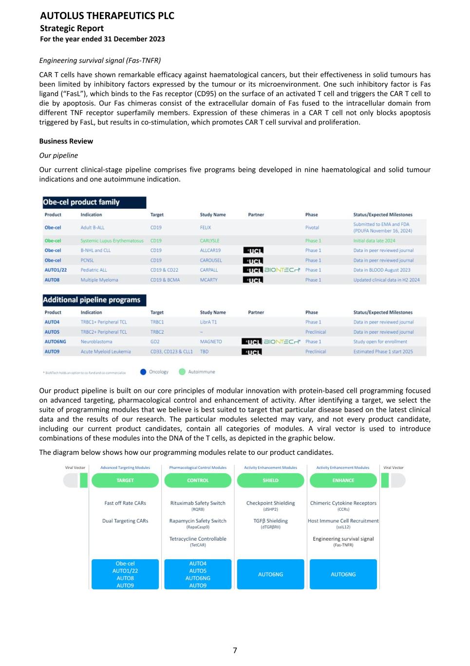 Engineering survival signal (Fas-TNFR) CAR T cells have shown remarkable efficacy against haematological cancers, but their effectiveness in solid tumours has been limited by inhibitory factors expressed by the tumour or its microenvironment. One such inhibitory factor is Fas ligand (“FasL”), which binds to the Fas receptor (CD95) on the surface of an activated T cell and triggers the CAR T cell to die by apoptosis. Our Fas chimeras consist of the extracellular domain of Fas fused to the intracellular domain from different TNF receptor superfamily members. Expression of these chimeras in a CAR T cell not only blocks apoptosis triggered by FasL, but results in co-stimulation, which promotes CAR T cell survival and proliferation. Business Review Our pipeline Our current clinical-stage pipeline comprises five programs being developed in nine haematological and solid tumour indications and one autoimmune indication. Our product pipeline is built on our core principles of modular innovation with protein-based cell programming focused on advanced targeting, pharmacological control and enhancement of activity. After identifying a target, we select the suite of programming modules that we believe is best suited to target that particular disease based on the latest clinical data and the results of our research. The particular modules selected may vary, and not every product candidate, including our current product candidates, contain all categories of modules. A viral vector is used to introduce combinations of these modules into the DNA of the T cells, as depicted in the graphic below. The diagram below shows how our programming modules relate to our product candidates. AUTOLUS THERAPEUTICS PLC Strategic Report For the year ended 31 December 2023 7